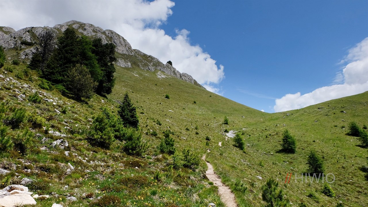 Unterhalb der bizarr anmutenden Felswände schlängelt sich der Weg durch sanfte Grashänge und ein Geröllfeld.