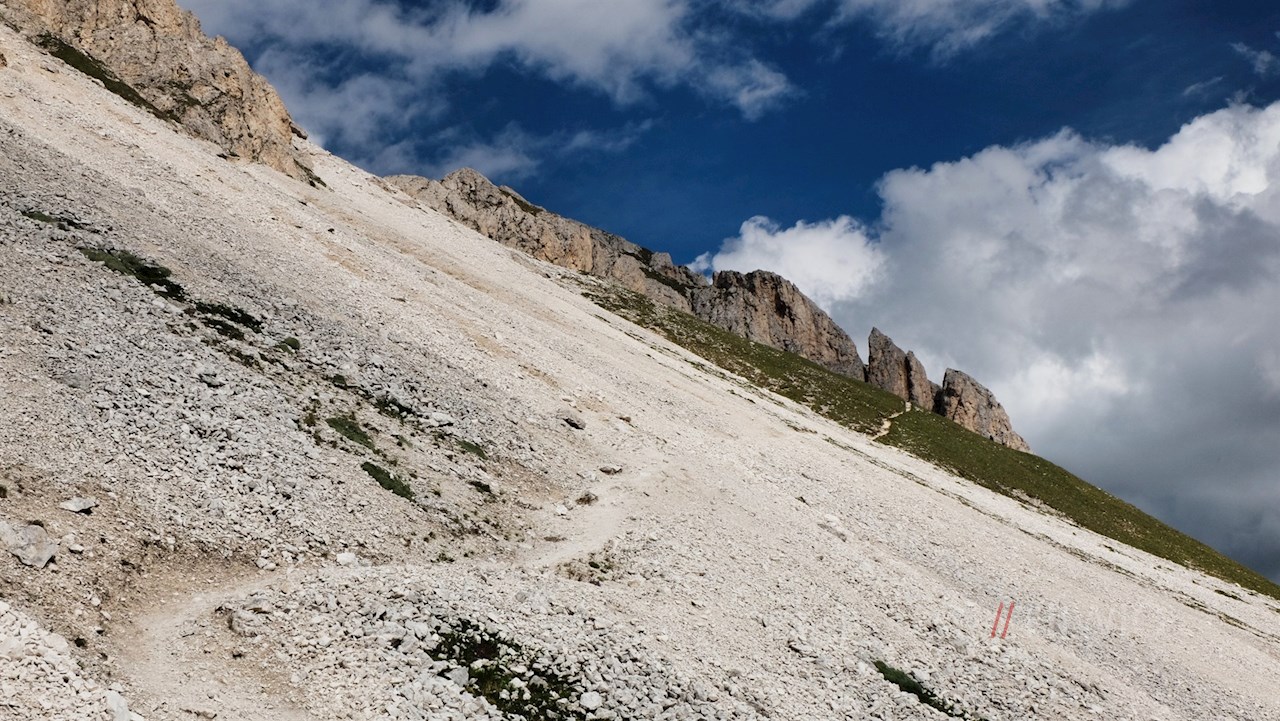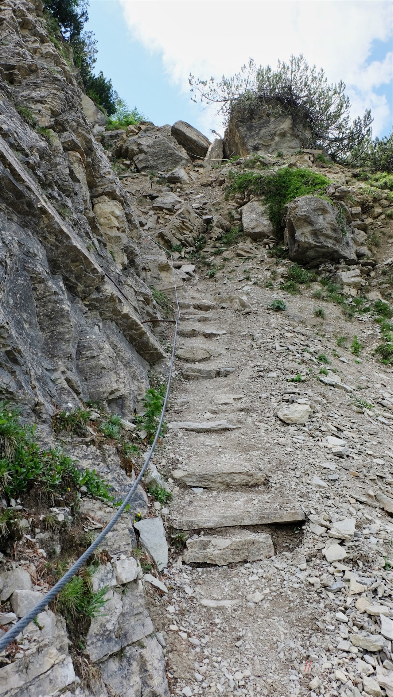 Schließlich tritt man aus dem Wald heraus und quert einen stein- und geröllbeschlagenen Hang. Eine etwas kniffligere Passage ist mit Stahlseilen gesichert.