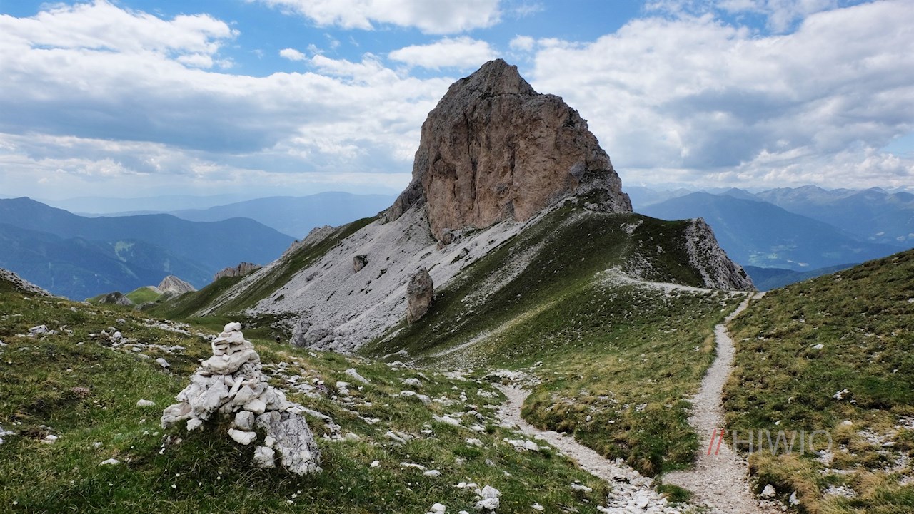 Zuletzt wandert man über den felsigen Bergrücken zum Gipfelkreuz des 2.653 m hohen Tullen empor. Oben angekommen, erschließen sich weite Ausblicke auf die umliegende Bergwelt. Namentlich die Villnösser Geisler, der Peitlerkofel und der Heiligkreuzkofel stechen ins Auge.
