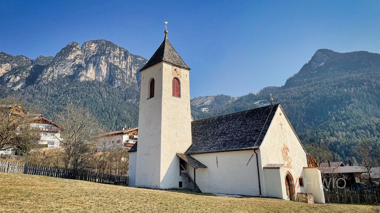 Die Wanderung nach Prösels beginnt im ländlich geprägten Weiler Ums südöstlich von Völs. Neben der Kirche St. Martin finden sich einige Parkmöglichkeiten.