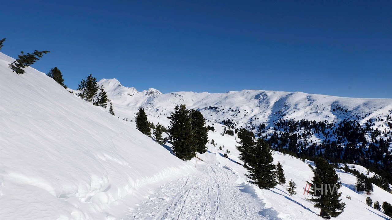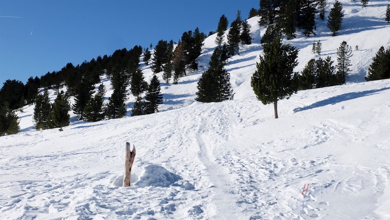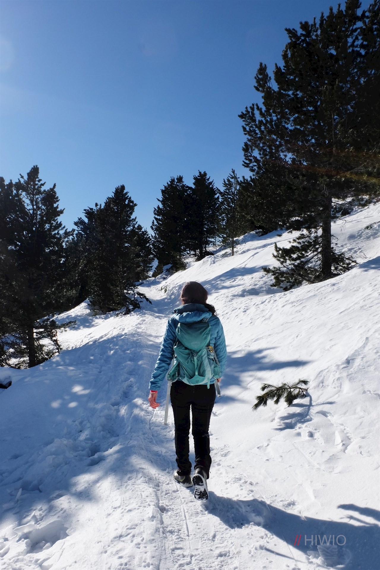 Vom Parkplatz steigt der Winterwanderweg Nr. 7 sanft, aber stetig durch verschneite Almwiesen, lichte Lärchenhaine und kleine Waldstücke in Richtung Getrumalm an. Da der Wanderweg auch als Rodelbahn genutzt wird, gleitet ab und an ein Rodler an uns vorbei.