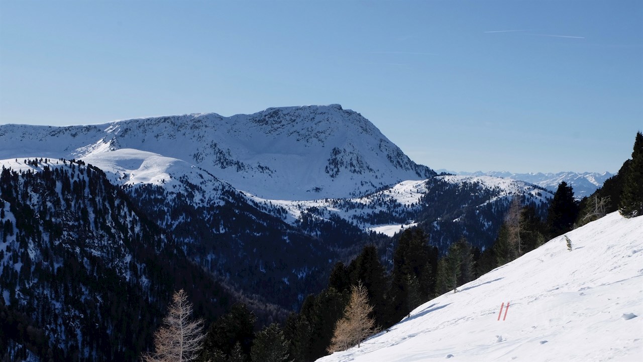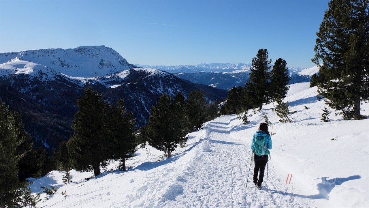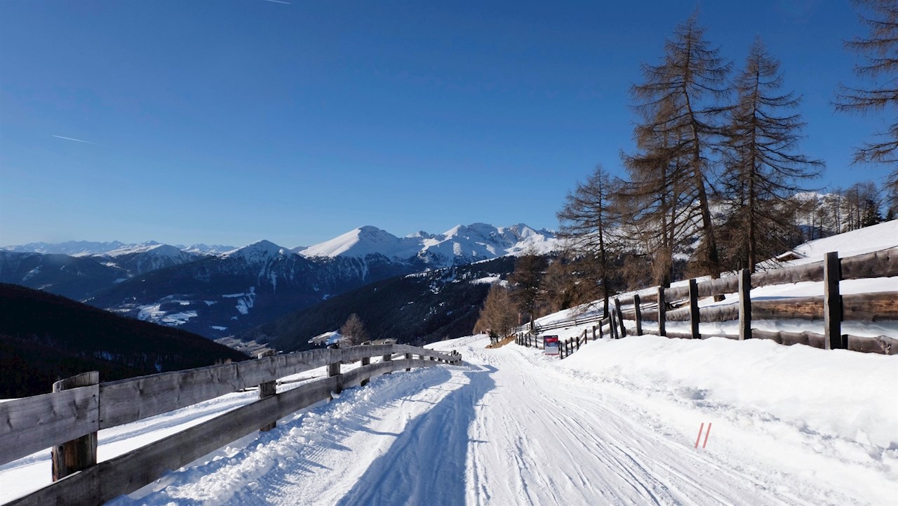 Links der Getrumalm zweigt der zunächst schmale Urlesteig ab. Er führt anfangs im leichten Anstieg und später im sanften Auf und Ab durch die bezaubernde Winterlandschaft und öffnet dabei atemberaubende Ausblicke auf die gegenüberliegenden Dolomiten: Nach und nach geraten namhafte Bergspitzen wie der Rosengarten, der Lang- und Plattkofel oder der Sellastock in unser Blickfeld, zu denen sich die Meraner Bergwelt am Horizont gesellt. Längs des Weges gewähren Infotafeln interessante Einblicke in die Landschaft.