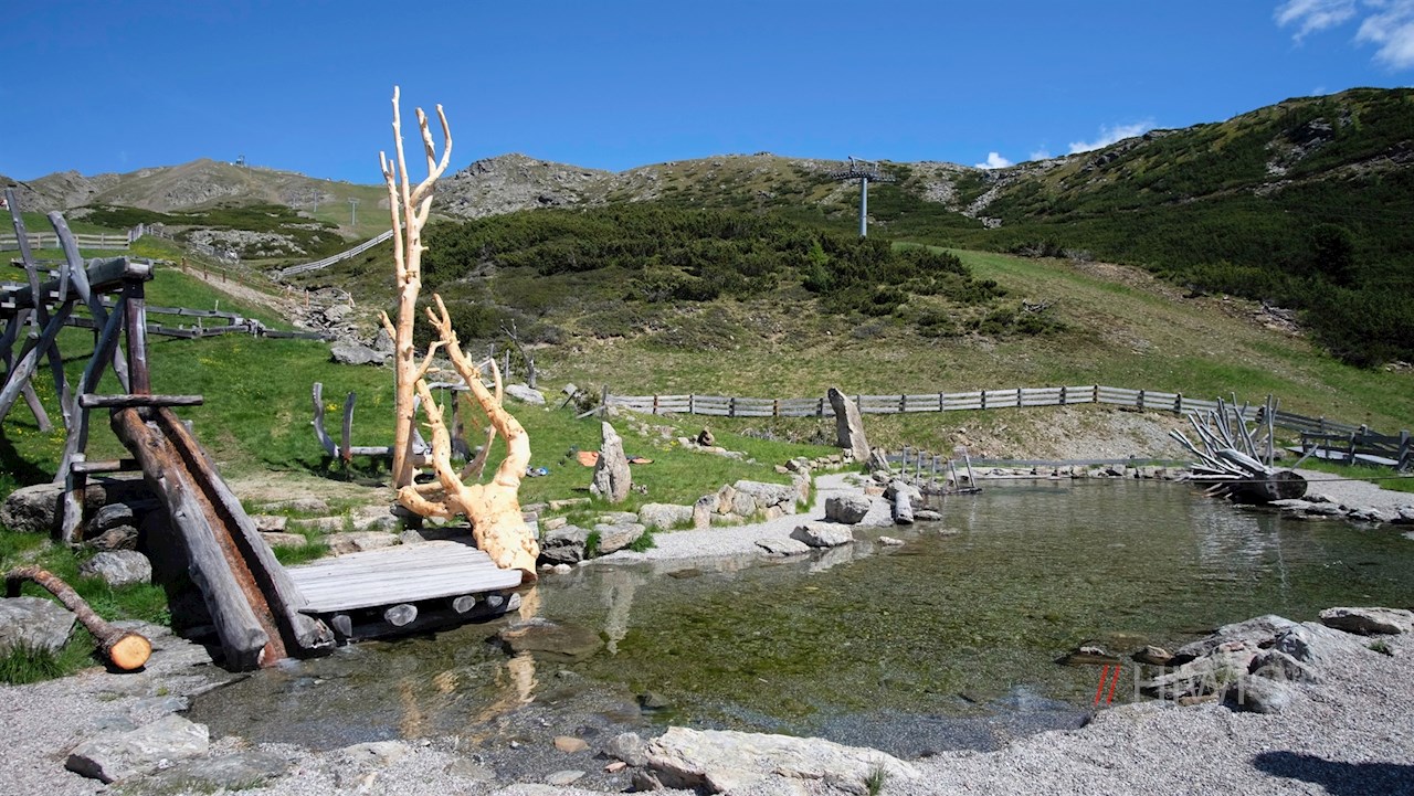 Bei der kinderfreundlichen Pfnatschalm hat man die anstrengendste Etappe des Urlesteigs hinter sich gebracht. Der nächste, nunmehr sanfter verlaufende Wegabschnitt ist dem Thema Wasser gewidmet: Gleich neben der Pfnatschalm lädt ein seichter Teich samt Floß zu vergnüglichen Wasserspielen ein, während weiter oben klappernde Wasserräder an jene nicht allzu ferne Zeit erinnern, in der das Korn noch mit der Kraft des Wassers zu Mehl verarbeitet wurde.