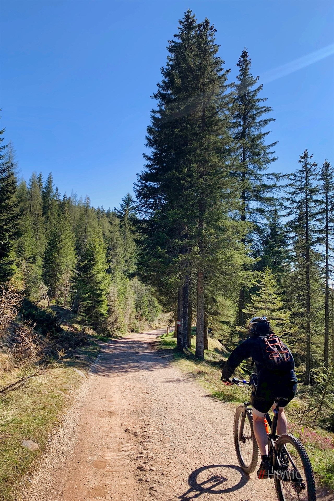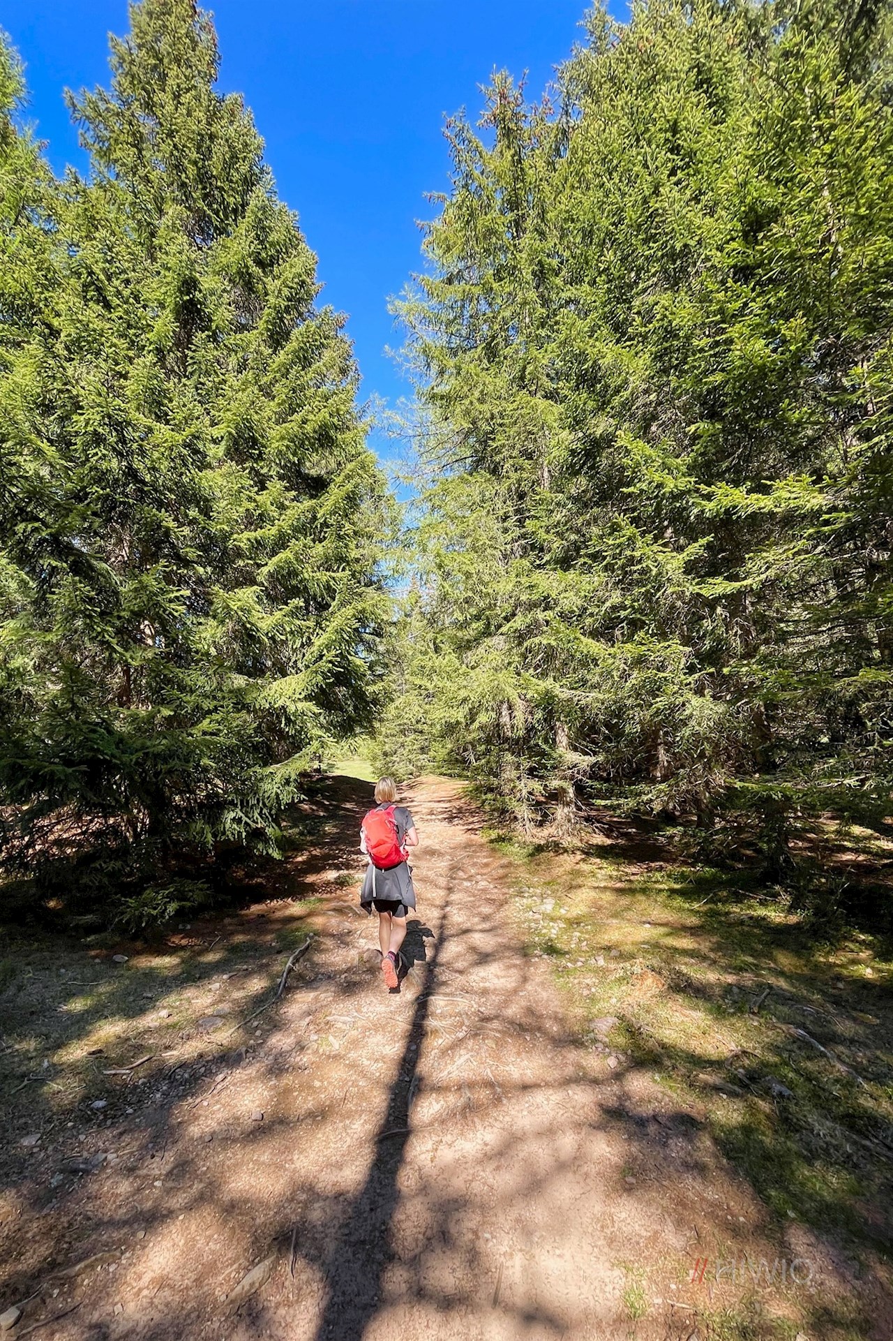 Weiterhin der Wegnummer 11 und später 11A folgend, taucht der Weg alsbald in schattenverheißende Lärchenwiesen und Wälder ein, durch die er sich im angenehmen Anstieg schlängelt.
