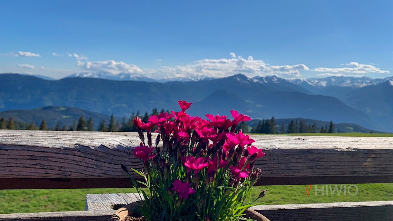 Wenig später gerät auch die Vöraner Alm in unser Blickfeld. Auf 1.875 m Höhe errichtet, zählt sie zu den höchstgelegenen Hütten des Tschögglbergs. Dementsprechend umfassend ist auch der Ausblick, der sich hier oben erschließt. Namentlich der zackenreiche Latemar, die Brentagruppe und die Gletscher des Adamello stechen ins Auge. So gesellt sich auf der sonnenverwöhnten Terrasse ein malerischer Ausblick zu den wohlverdienten Gaumenfreuden.