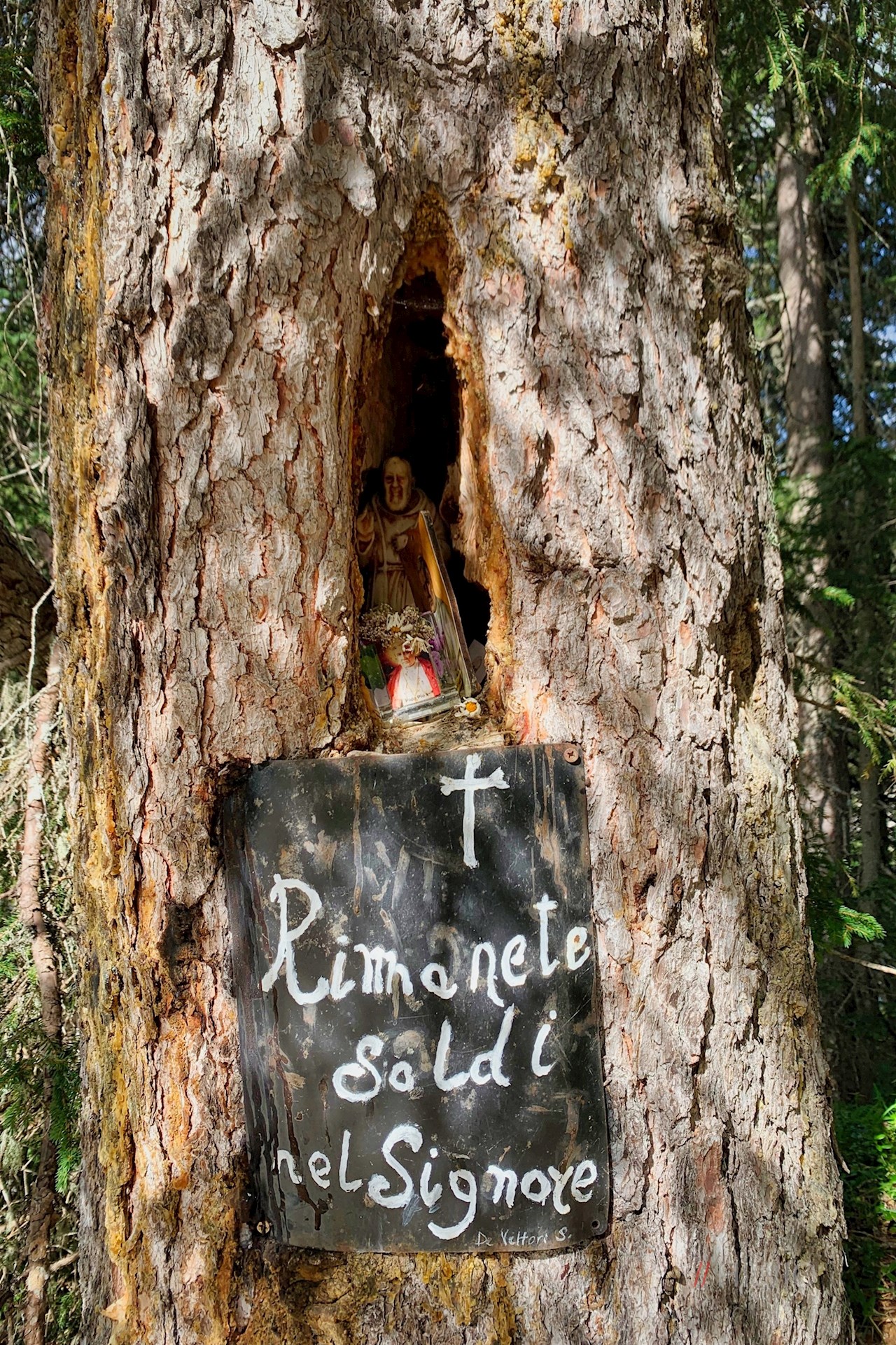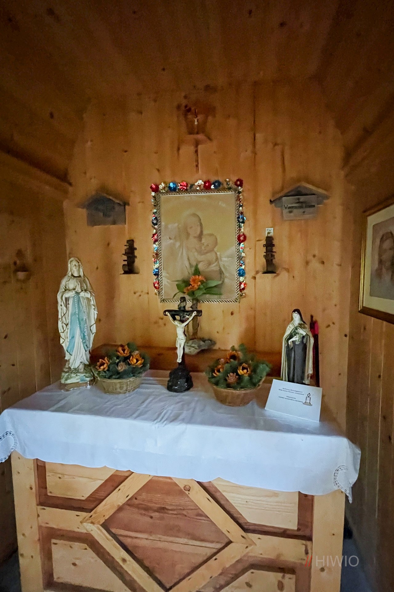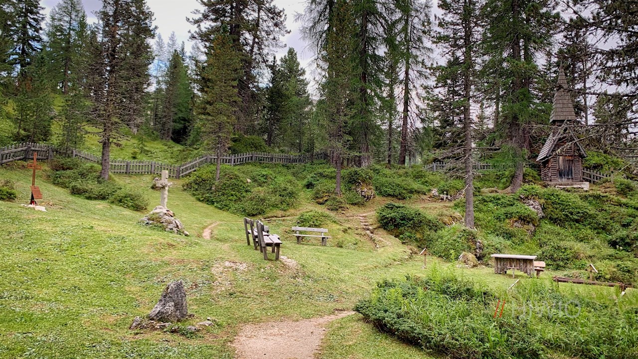 Wenig später zweigt links der breite Weg zum nahen Soldatenfriedhof Valparola ab. Der beschauliche Waldfriedhof wurde noch während der Kampfhandlungen im Juni 1916 errichtet. Damals war er durch eine Frontstraße in einen kleineren deutschen und einen größeren österreichisch-ungarischen Bereich geteilt. In der kleinen, aus Zirbenholz erbauten Kapelle gewährt ein Aushang einen kleinen Einblick in die Geschichte des mittlerweile renovierten Friedhofs, der sich noch zu Beginn der 80iger Jahre in einem desolaten Zustand befand.