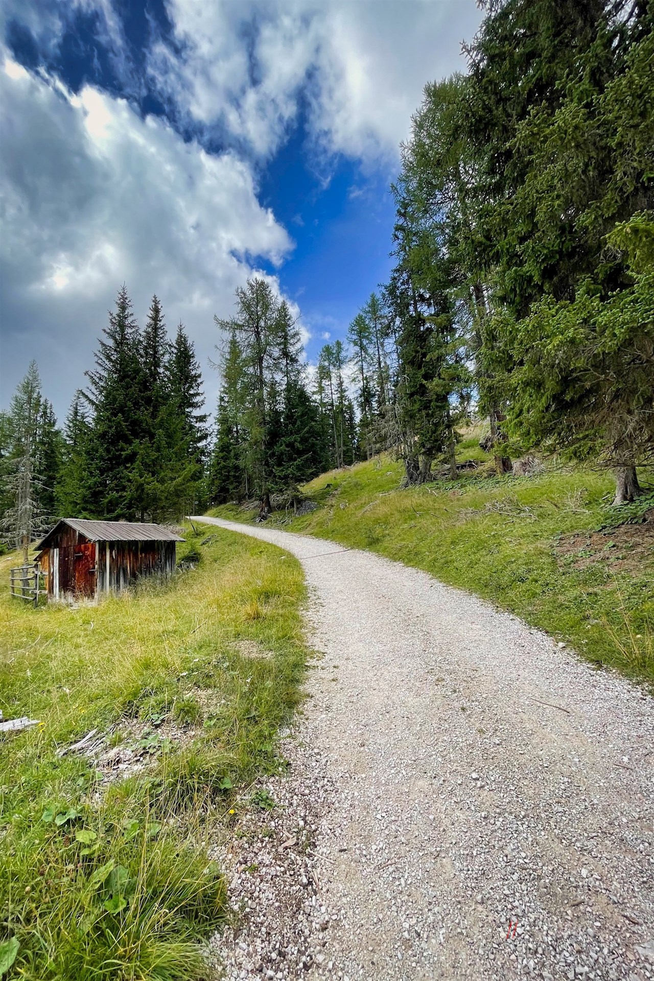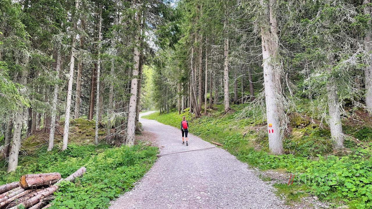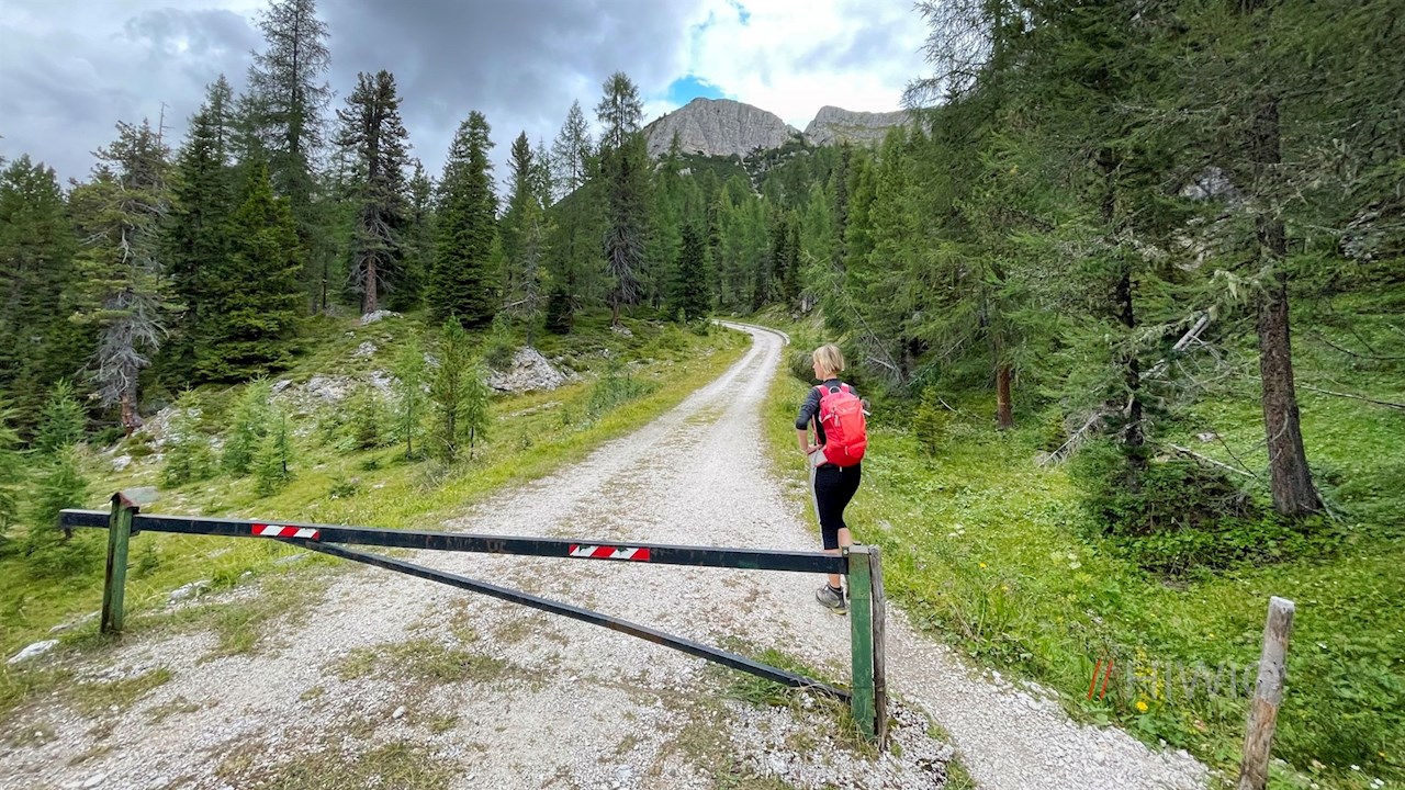 Von der Valparola Alm schlängelt sich der sanft ansteigende Waldweg in Richtung Valparolapass weiter. Nach einer guten Viertelstunde steten Wanderns mündet er in die Passstraße, der er auf der gegenüberliegenden Straßenseite nach oben folgt.