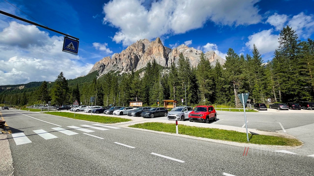 Die Wanderung zum Soldatenfriedhof Valparola beginnt auf dem großen, zwischen St. Kassian und dem Valparolapass gelegenen Parkplatz Sciare, der auch mit den öffentlichen Bussen angefahren werden kann.