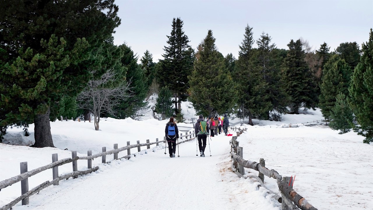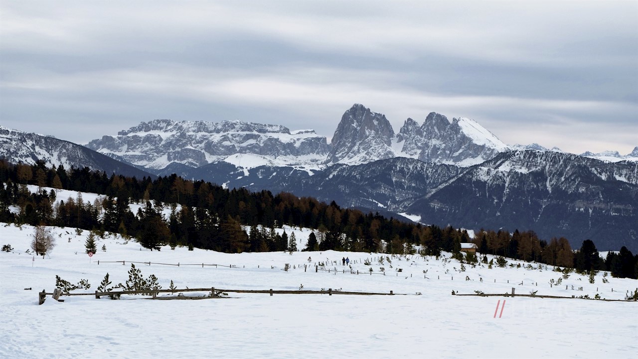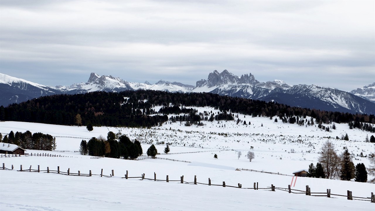 Nahe der Gasserhütte zweigt der gewalzte Wanderweg Nr. 6 in Richtung Villanderer Berg ab. Er führt im sanften Anstieg durch die winterlich verschneite Almlandschaft und öffnet dabei verträumte Ausblicke auf die hinter uns aufragenden Dolomiten.