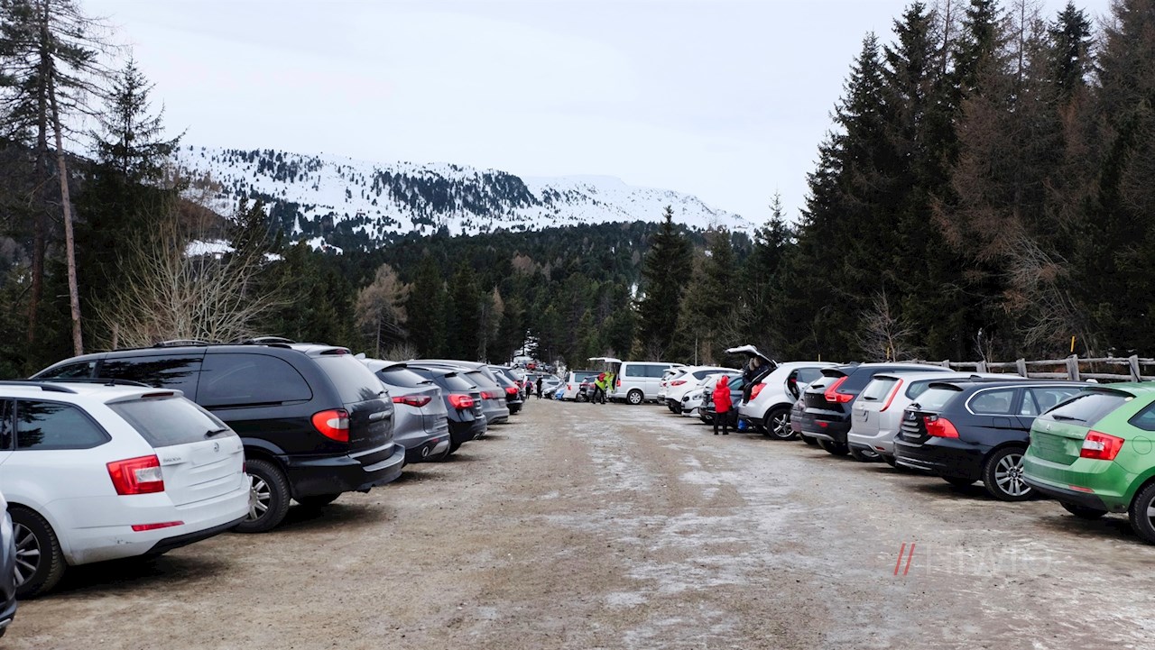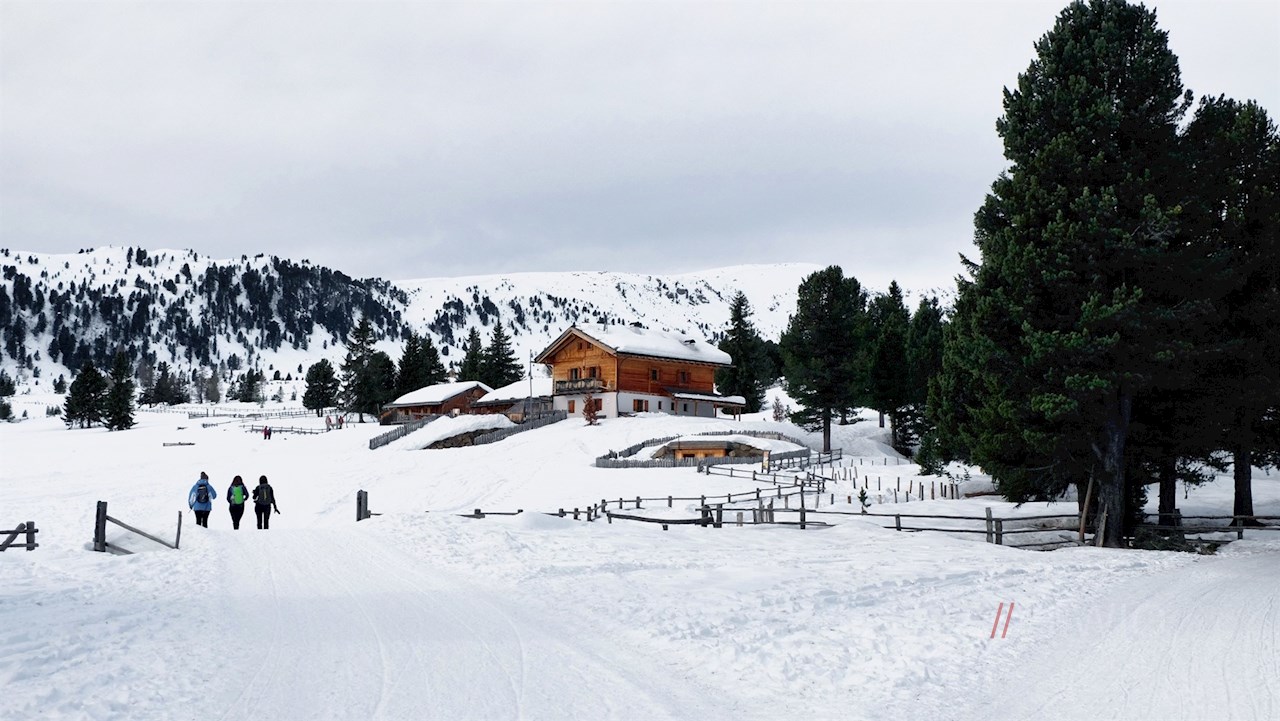 Die Winterwanderung zur Moar in Plun Hütte nimmt am Parkplatz Saltnerstein am Rande der Villanderer Alm ihren Anfang.