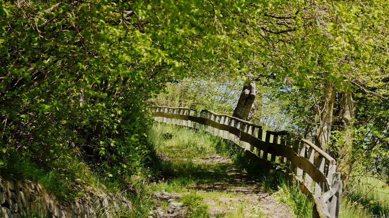 Bei der Dorfkirche folgt man zunächst dem asphaltierten Weg Nr. 11, bis am rechten Wegesrand der mit einem Hahn markierte Bergbauernweg abzweigt.