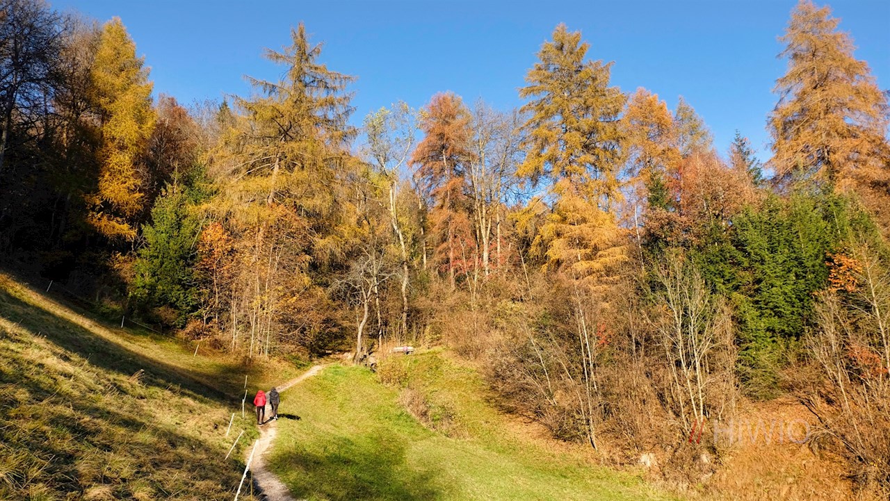 Dahinter quert der Panoramaweg sanfte Mischwaldhänge. Auf etwa halbem Wege zweigt links ein kleiner Verbindungssteig ab, der zum bereits bekannten Sunnseitnweg hinabführt. Auf diesem wandert man nach St. Peter zurück, wo man die Wanderung in einem der einladenden Cafés ausklingen lassen kann.