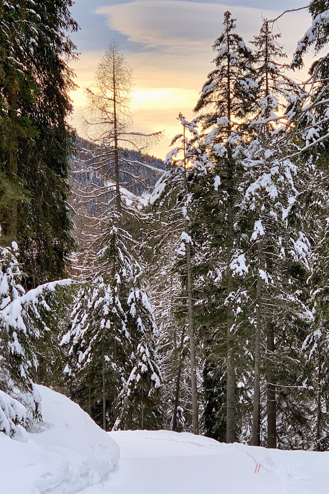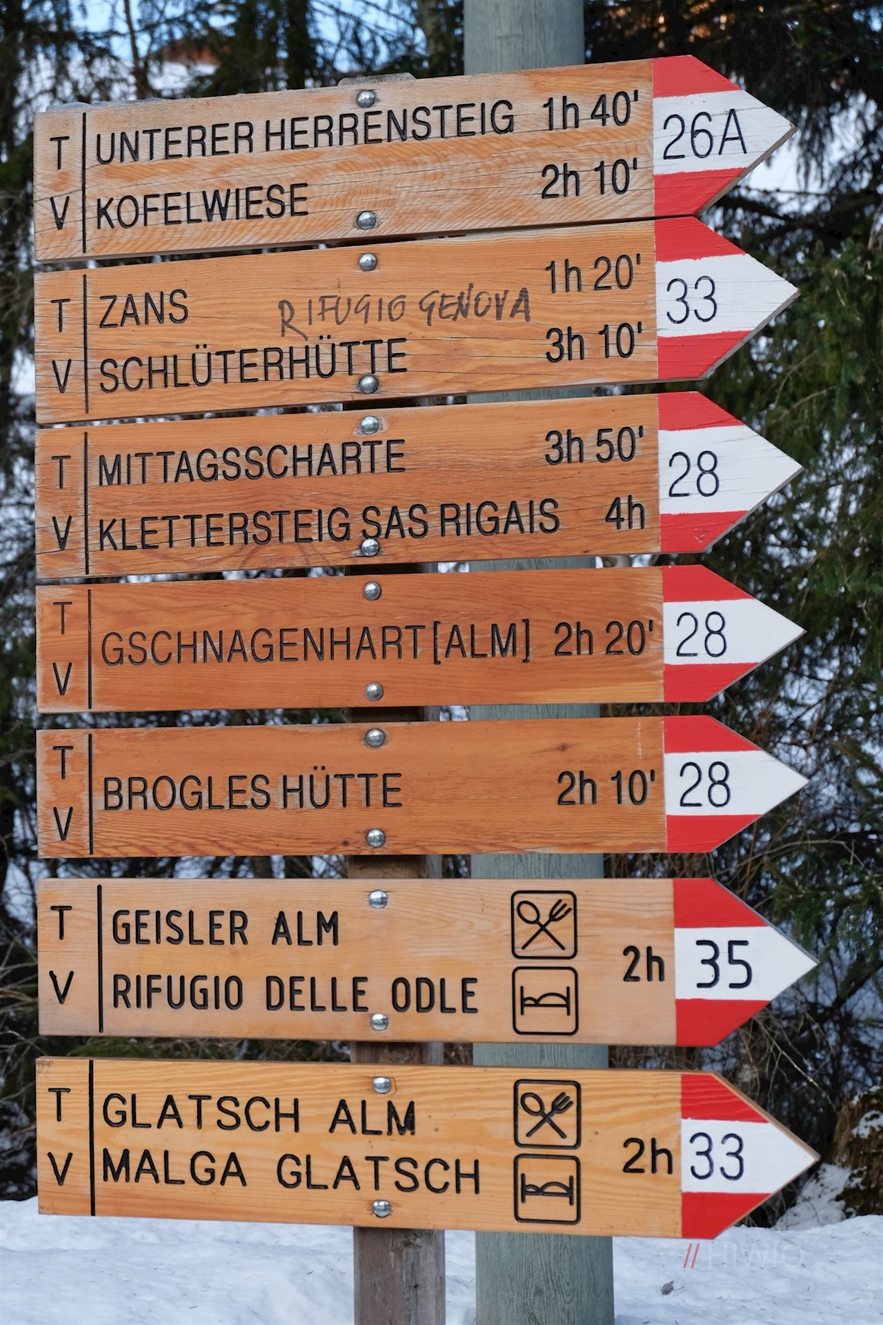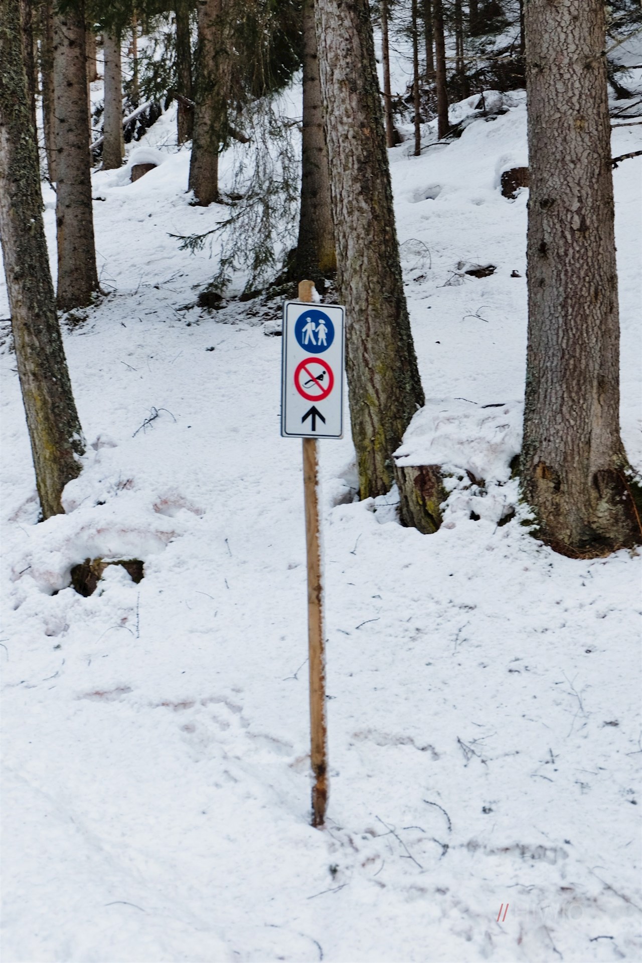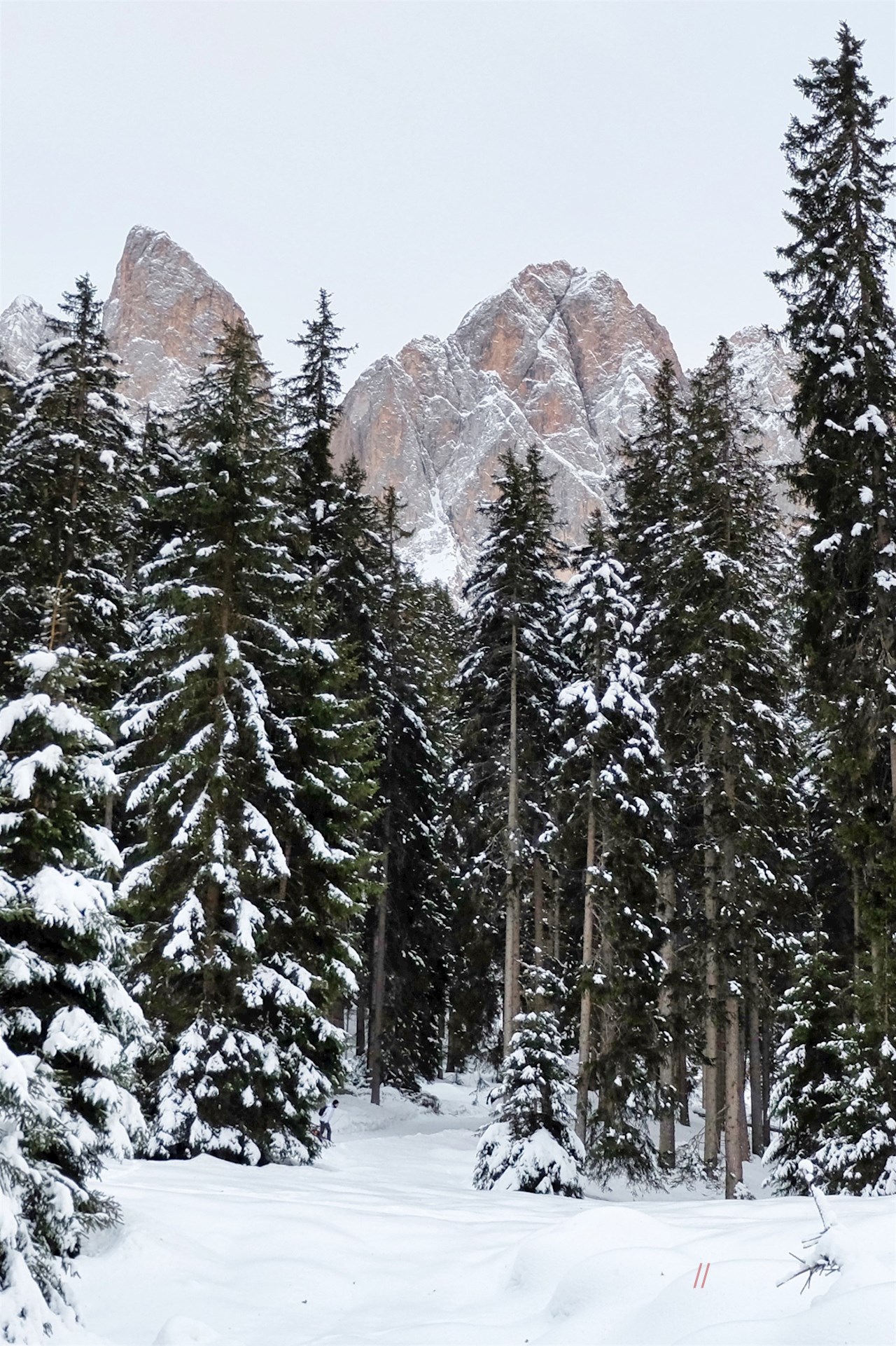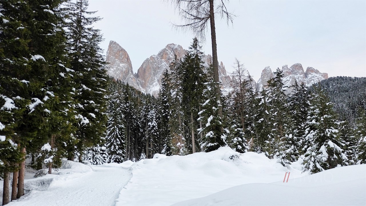 Dem Wegweiser Nr. 33 in Richtung Zans folgend, führt der gebahnte Wanderweg im angenehmen, vom Rauschen des Villnösser Baches begleiteten Anstieg durch den tiefverschneiten Wald. Ab und an öffnen sich verträumte Ausblicke auf die spitz zulaufenden Villnösser Geisler und das gegenüberliegende Rittner Horn.
