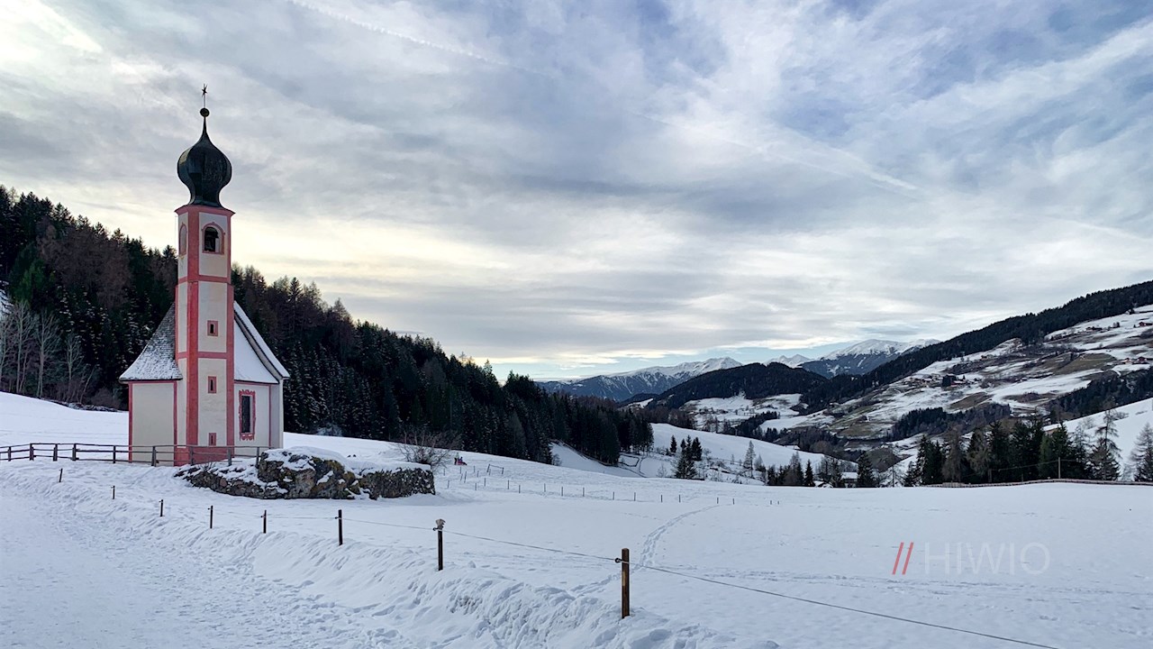 Die Winterwanderung nach Zans nimmt an der Bushaltestelle Ranui neben der malerischen St. Johann Kirche in St. Magdalena ihren Ausgang. Hier finden sich auch einige Parkmöglichkeiten.