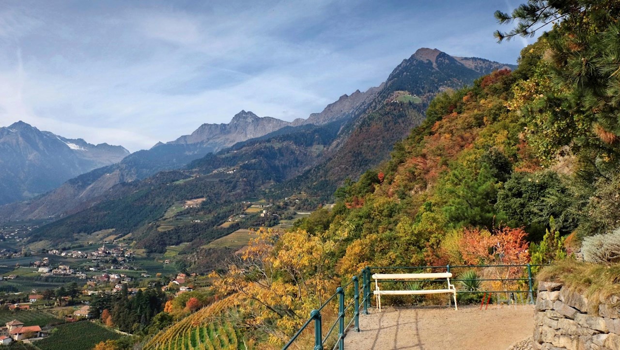 Nach einem kurzen Anstieg führt die von mediterranen und alpinen Pflanzen gesäumte Höhenpromenade nahezu eben am sonnenverwöhnten Hang des Küchelberges entlang. Sie wartet mit einer üppigen botanischen Vielfalt und mit schönen Ausblicken auf die Meraner Altstadt und das Burggrafenamt auf.
