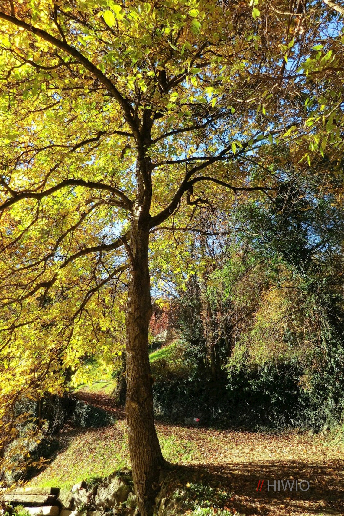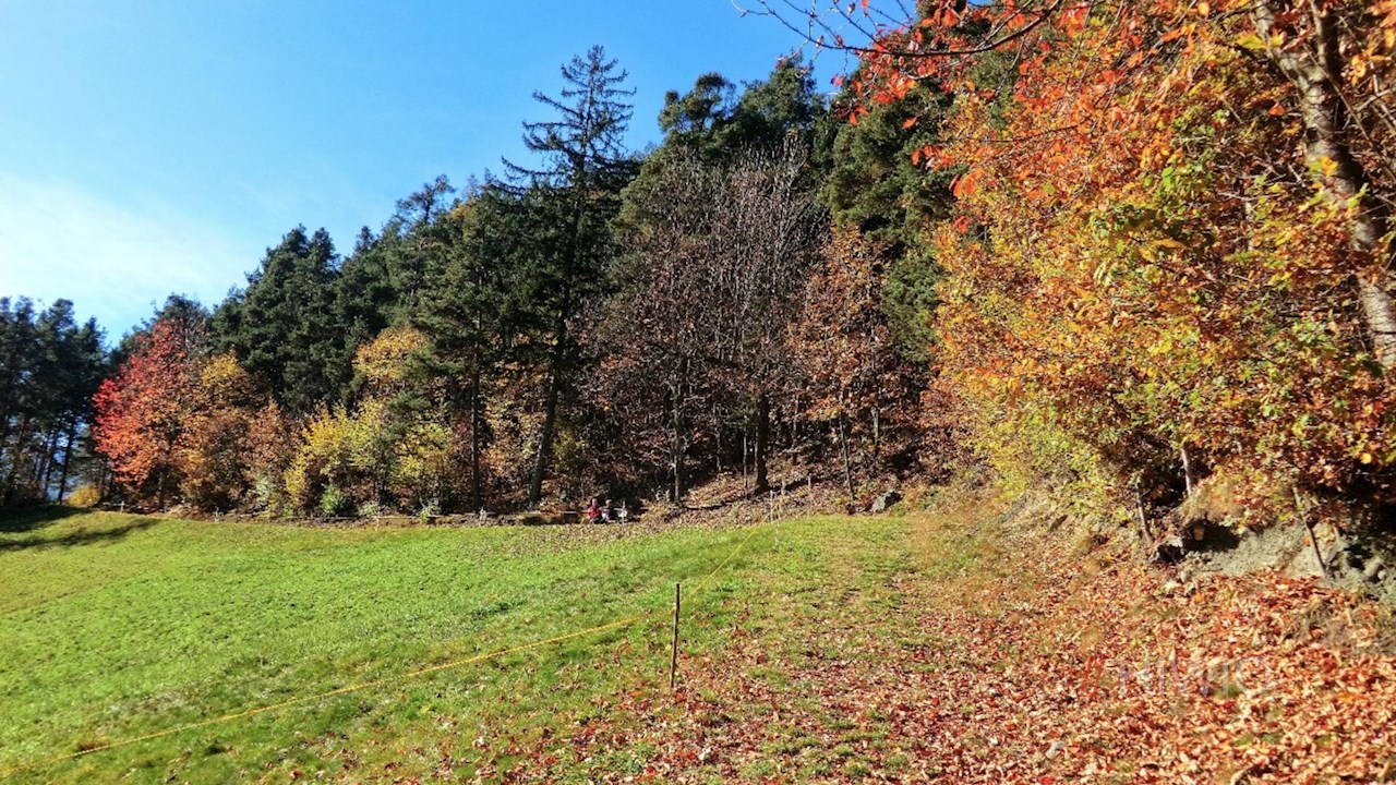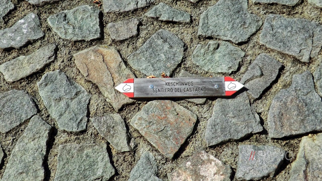 Wir aber zweigen nach dem engen Tunnel nach links ab und folgen dem mit einer Kastanie markierten „Keschtnweg“.