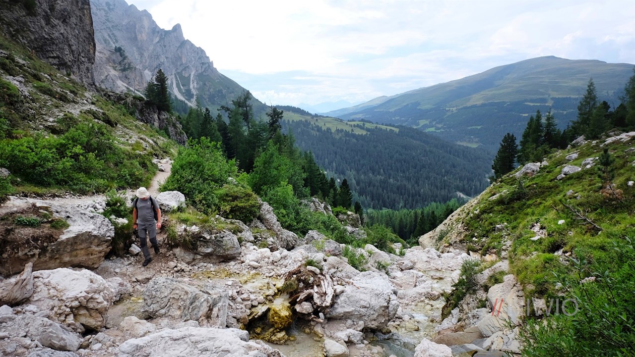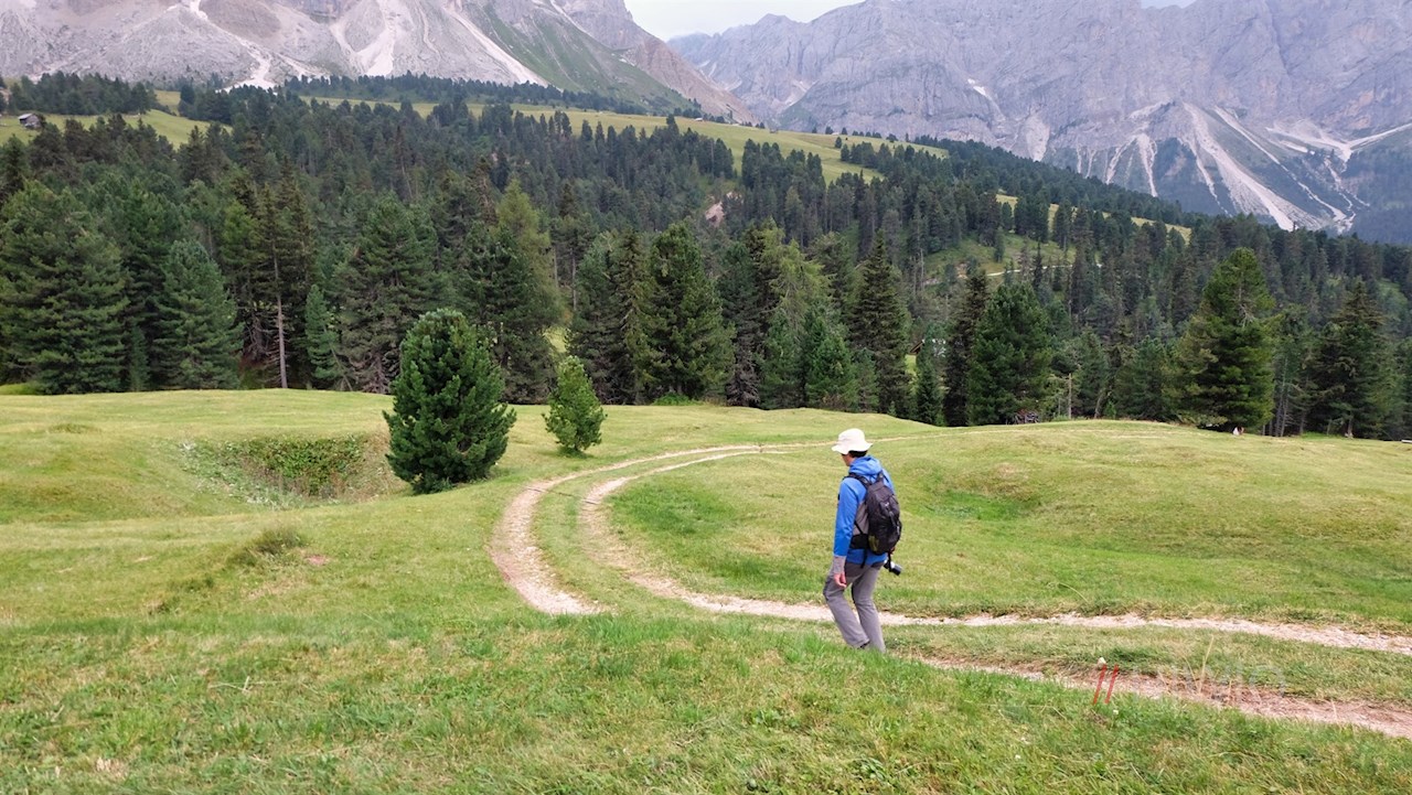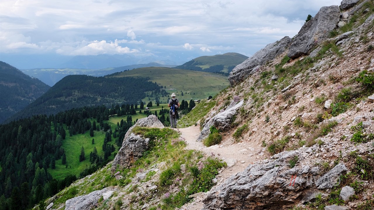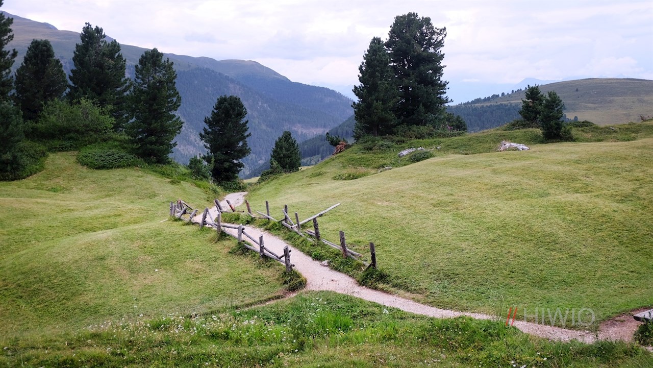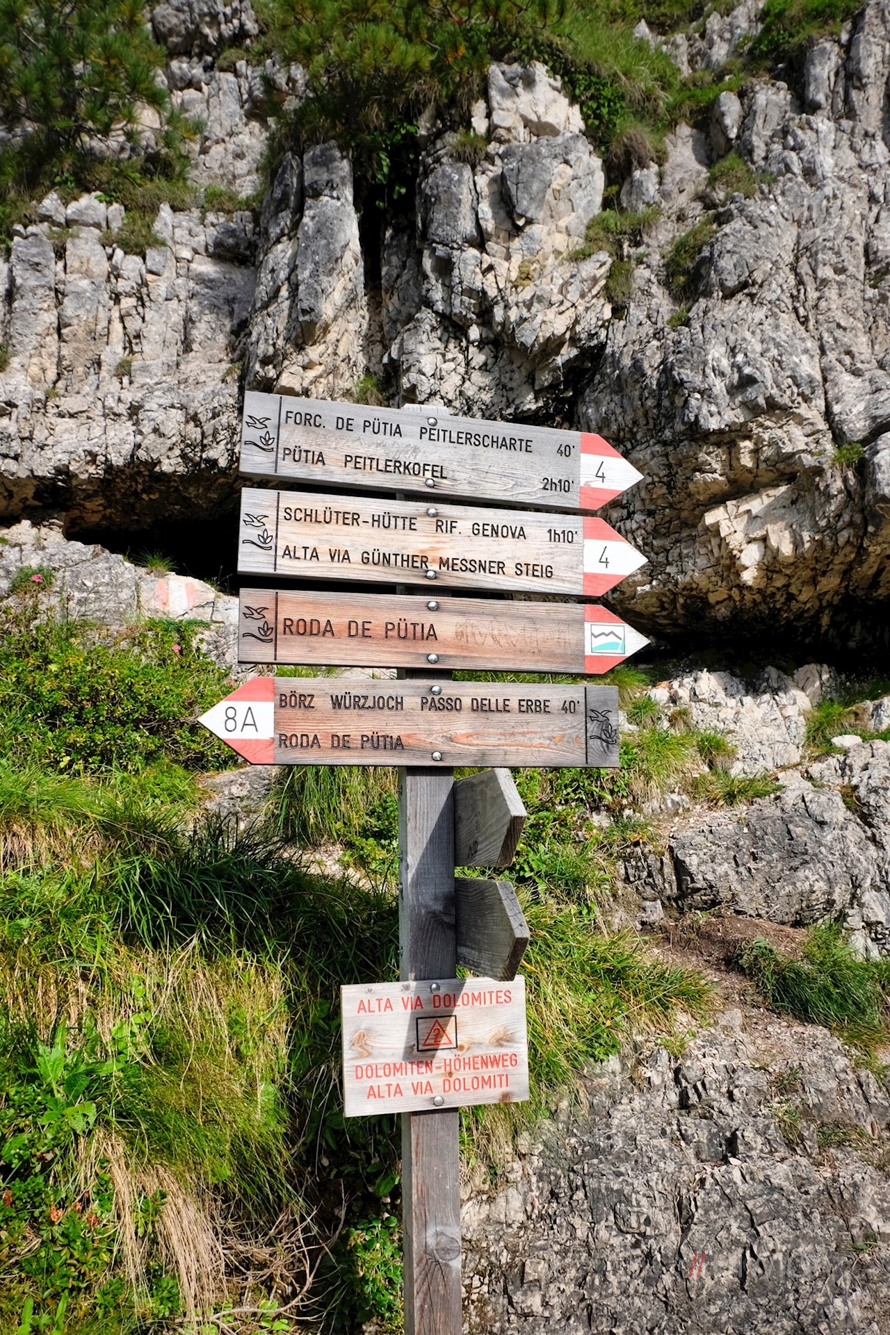 An der nächsten Weggabelung geht er in den Steig Nr. 4 über, von dem kurz darauf der Dolomiten Höhenweg Nr. 8A in Richtung Würzjoch links abzweigt. Während er im sanften Auf und Ab die teils steil abfallenden Hänge am Fuße des Peitler quert, eröffnet er schöne Ausblicke auf die ringsum aufragende Bergwelt mit dem imposanten Tullen, dem sanften Maurerberg oder dem aussichtsreichen Gabler.