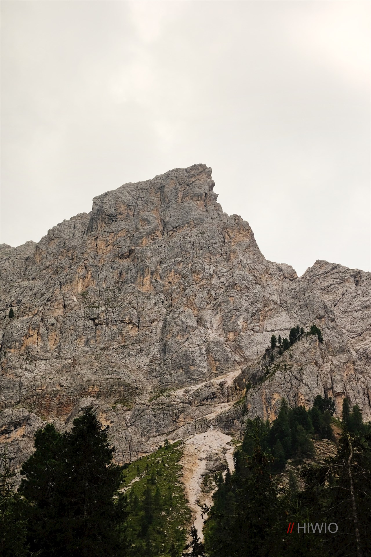 Von den beiden Almhütten steigt der Weg sanft auf das nahe Würzjoch ab. Haben sich bereits zuvor immer neue Perspektiven auf den Peitlerkofel entfaltet, öffnet ein wurzelbeschlagener Aussichtspunkt atemberaubende Ausblicke auf seine freigelegte Nordseite. Die zahlreichen Schichten gewähren tiefe Einblicke in die Jahrmillionen währende Erdgeschichte der Dolomiten.
