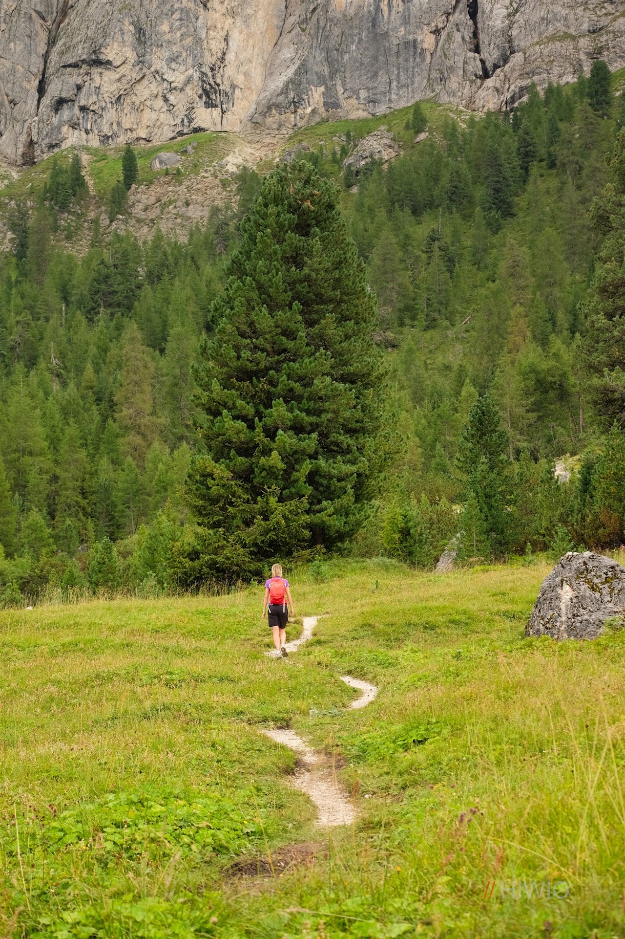 Am Parkplatz zweigt der Wanderweg Nr. 1 in Richtung Peitlerscharte ab. Er führt im steten Anstieg über die teils schotter- und steinbeschlagenen Wald- und Wiesenhänge und nähert sich dabei zusehends den imposanten Felswänden des Peitlerkofel.