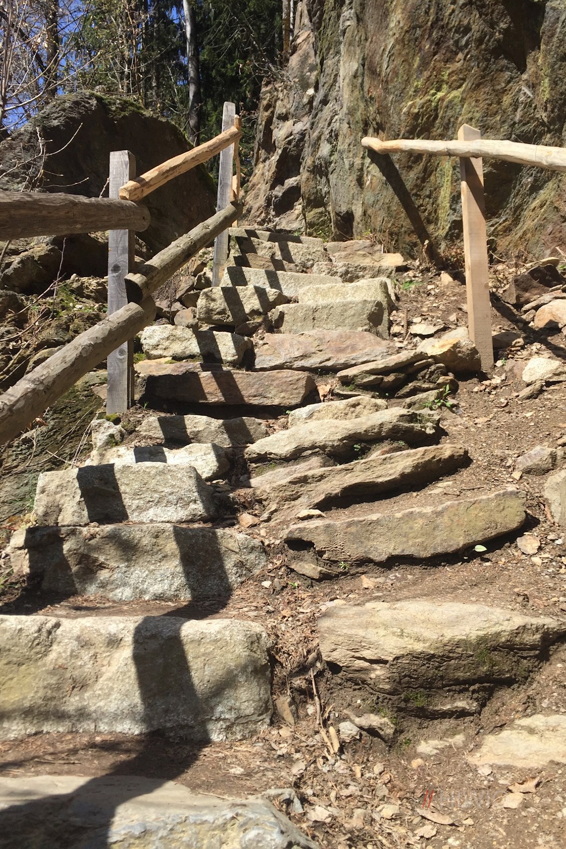 Schließlich kreuzt man den Schnuggenbach, aus dem die vier Schnuggenwaale gespeist werden. Hier wandert man die Steinstufen der sogenannten "Katzenleiter" hoch und erreicht wenig später die Talstation Taser.