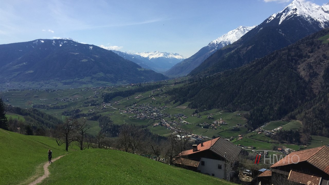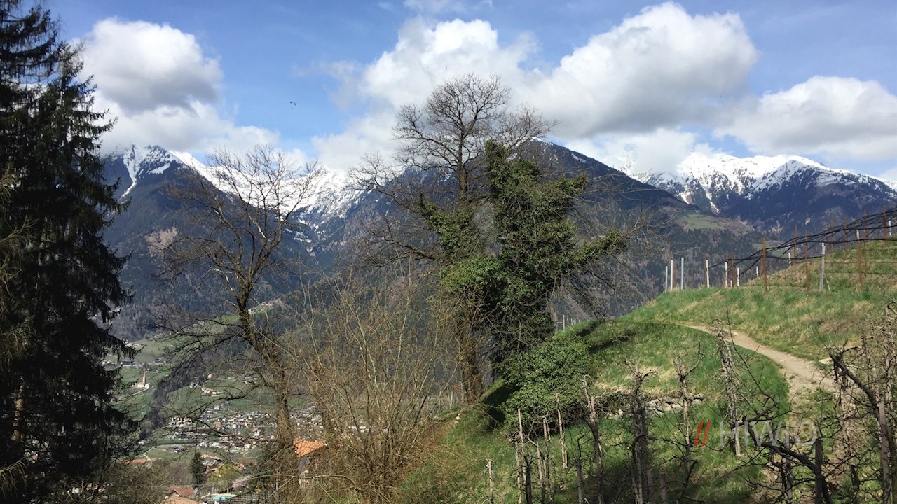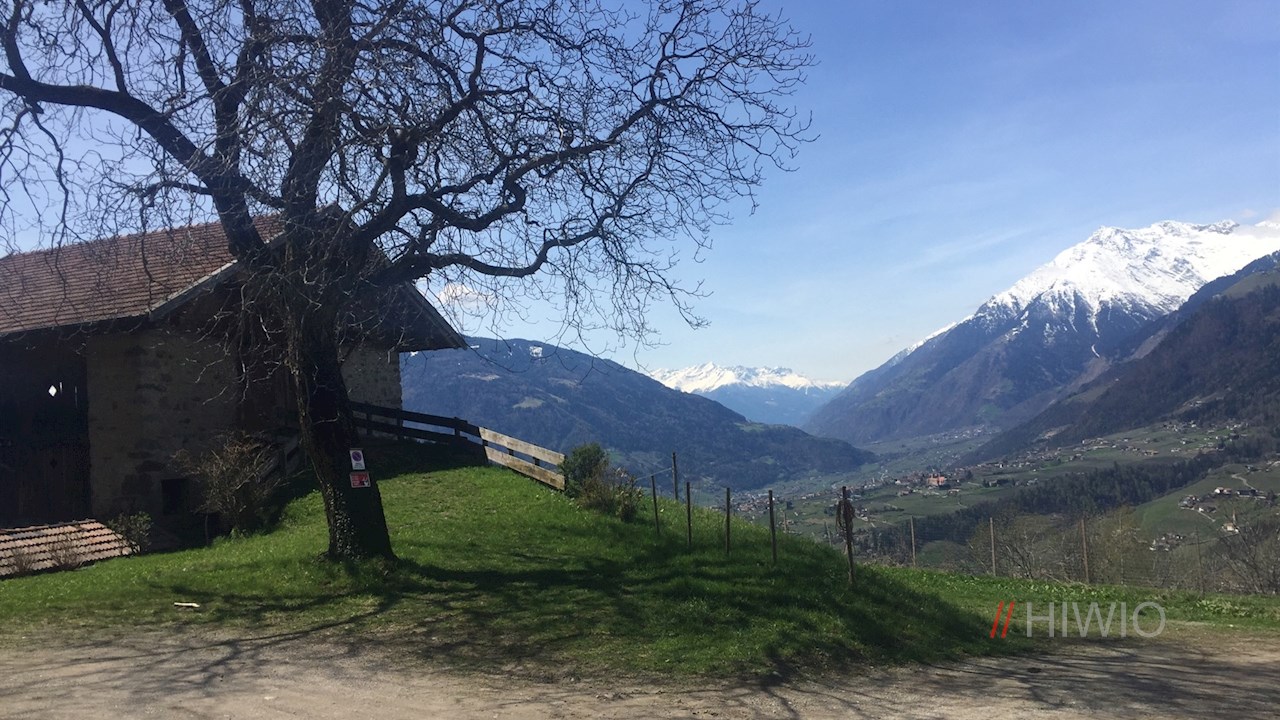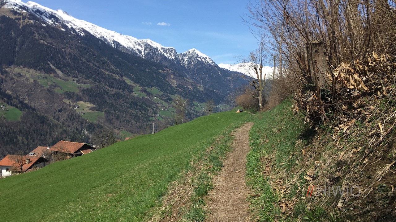 Nahe der pittoresken, freskengeschmückten Dorfkirche zweigt links der mit der Nr. 18 markierte Weg zum Schenner Waalweg ab. Er führt durch blühende Apfelwiesen, die schöne Ausblicke auf Dorf Tirol und die dahinter liegende Bergwelt mit der beliebten Mutspitze eröffnen.