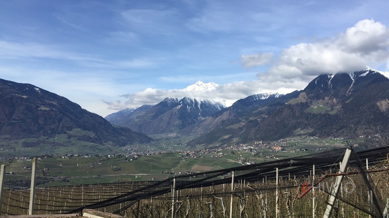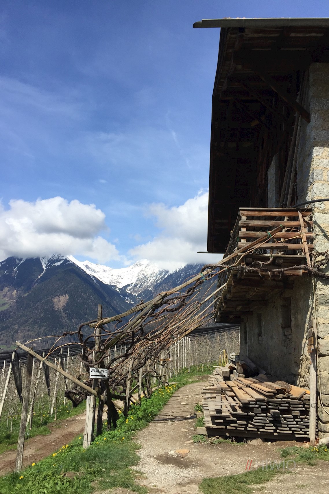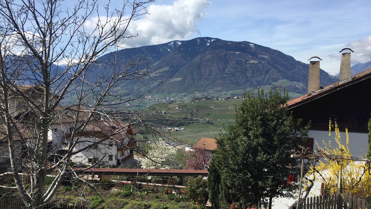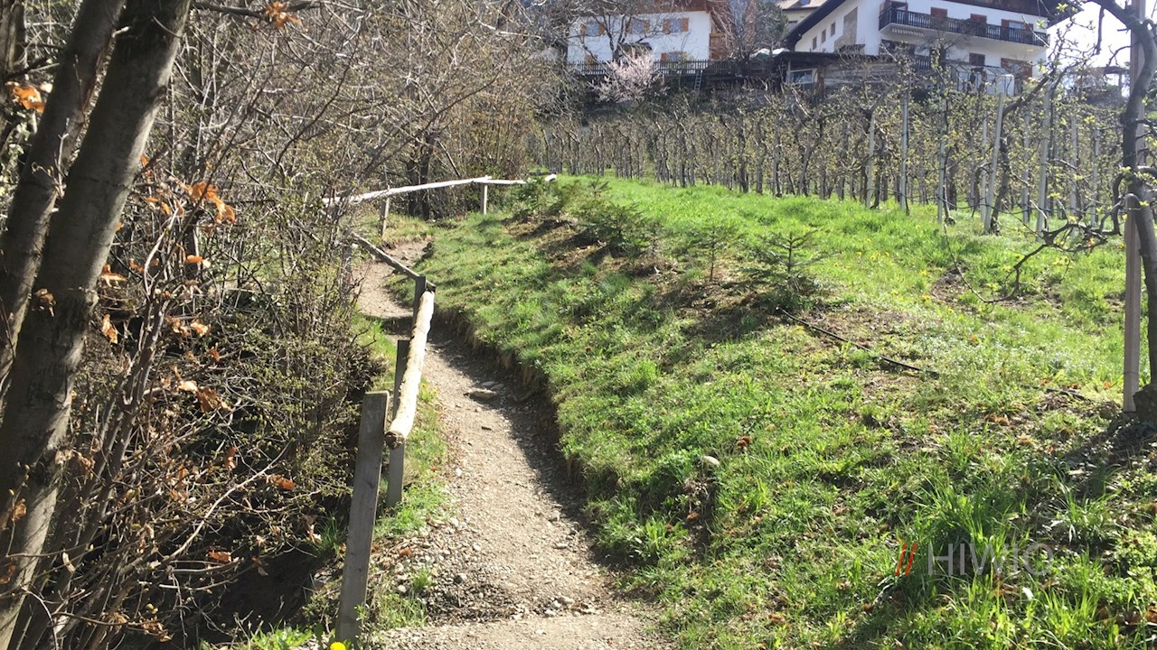 Nahe der pittoresken, freskengeschmückten Dorfkirche zweigt links der mit der Nr. 18 markierte Weg zum Schenner Waalweg ab. Er führt durch blühende Apfelwiesen, die schöne Ausblicke auf Dorf Tirol und die dahinter liegende Bergwelt mit der beliebten Mutspitze eröffnen.