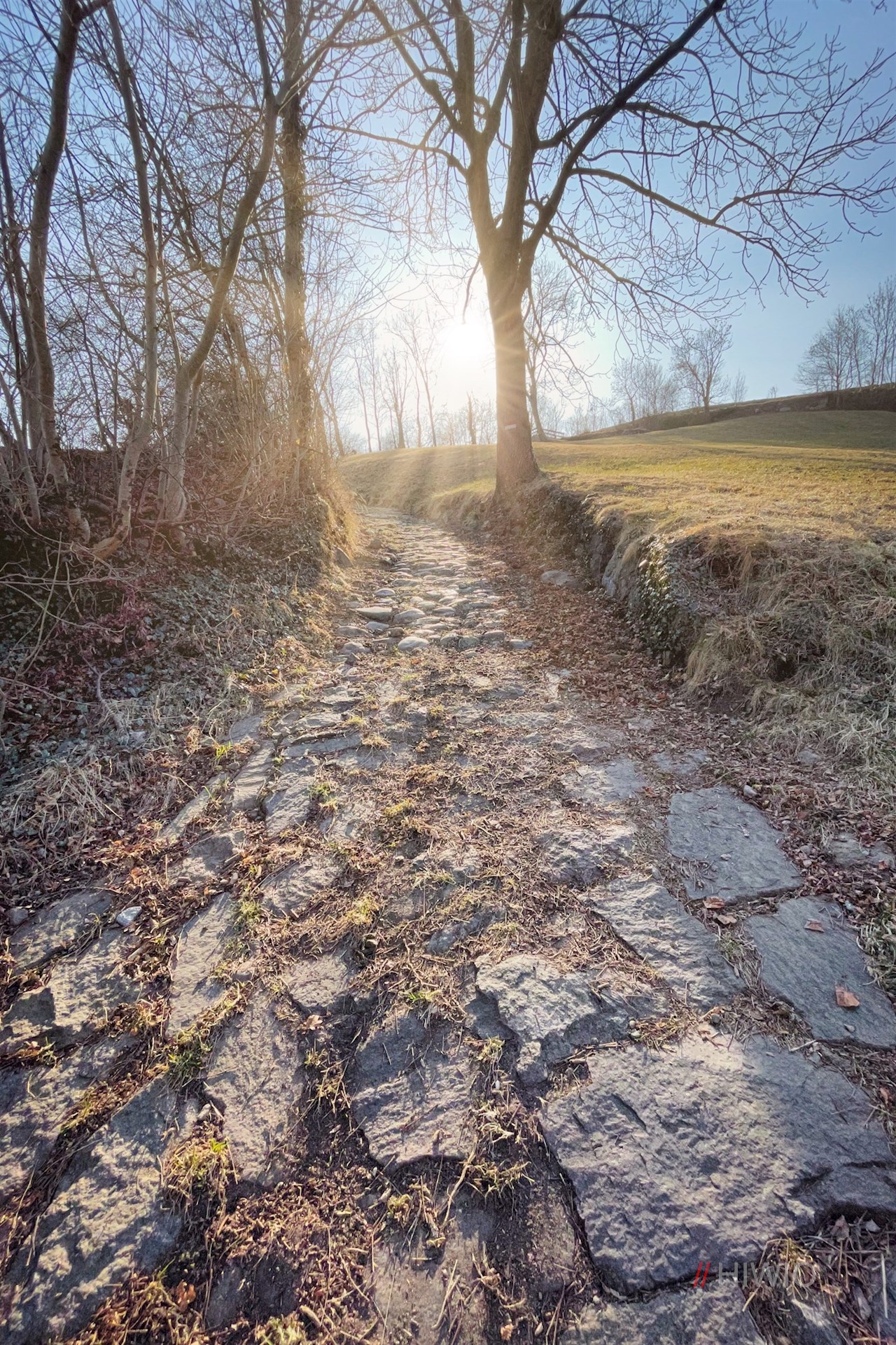 Er folgt zunächst einem asphaltierten Sträßchen nach unten und mündet schließlich erneut in einen schönen Wald- und Wiesenweg.