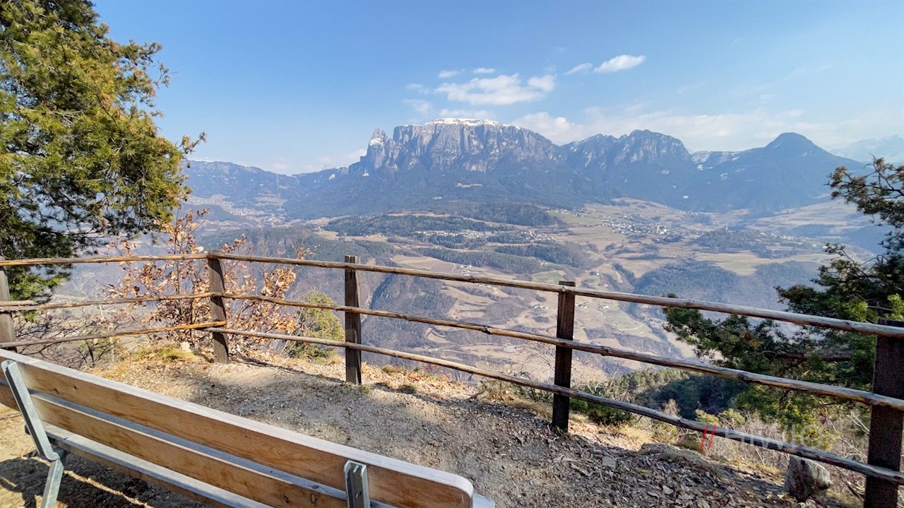 Auf dem steil abfallenden Felssporn entfaltet sich nämlich ein malerischer Ausblick auf Völs, die umliegenden Dörfer und dahinter aufstrebenden Berge, von denen insbesondere der majestätische Schlern, die Hammerwand, die Völsegger Spitze und die anmutigen Felsspitzen des Latemar ins Auge stechen. Eine Aussichtsbank lädt zum Genießen dieser traumverlorenen Idylle ein.