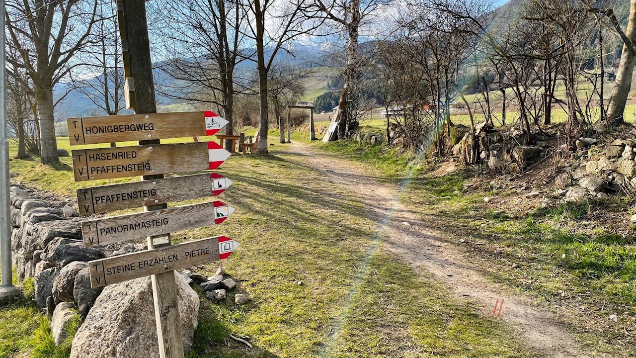 Die Wanderung nach Issing beginnt beim Sportplatz in Pfalzen, um den sich zahlreiche Parkplätze finden.