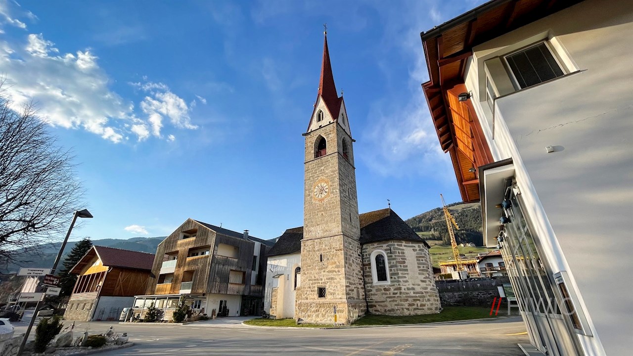 Der Wegnummer 5 in Richtung Rathausplatz folgend, wandert man zunächst zur suggestiven, dem heiligen Cyriak geweihten Pfarrkirche in der Dorfmitte.