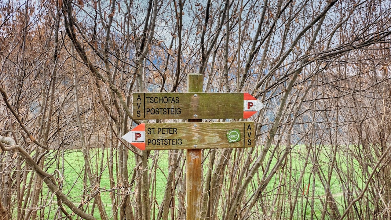 Der Poststeig nimmt im Eisacktaler Dorf Lajen seinen Anfang. Am östlichen Dorfeingang weist ein mit einem großen P markiertes Wanderschild den Einstieg in den Poststeig.