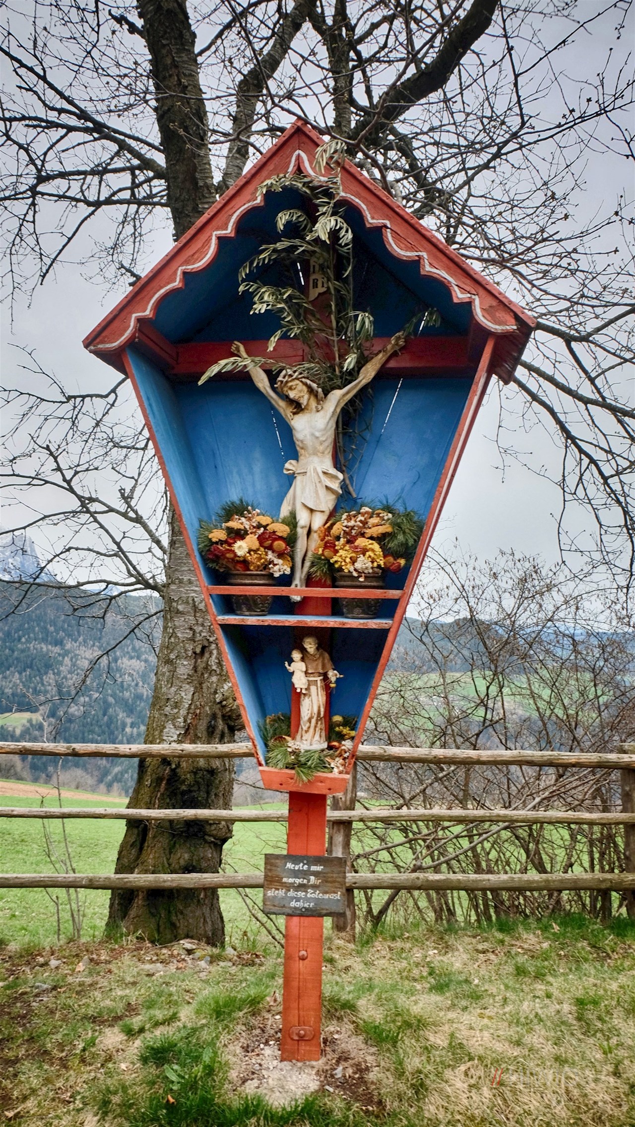 Er zieht sich im sanften Anstieg zum nahen Weiler Tschöfas und führt dann ohne nennenswerte Höhenunterschiede durch sonnenverwöhnte Wiesen und lichte Waldstücke in Richtung St. Peter weiter. Unterwegs entfalten sich malerische Ausblicke auf die umliegenden Berge, von denen namentlich die Raschötz und die Langkofelgruppe ins Auge stechen.