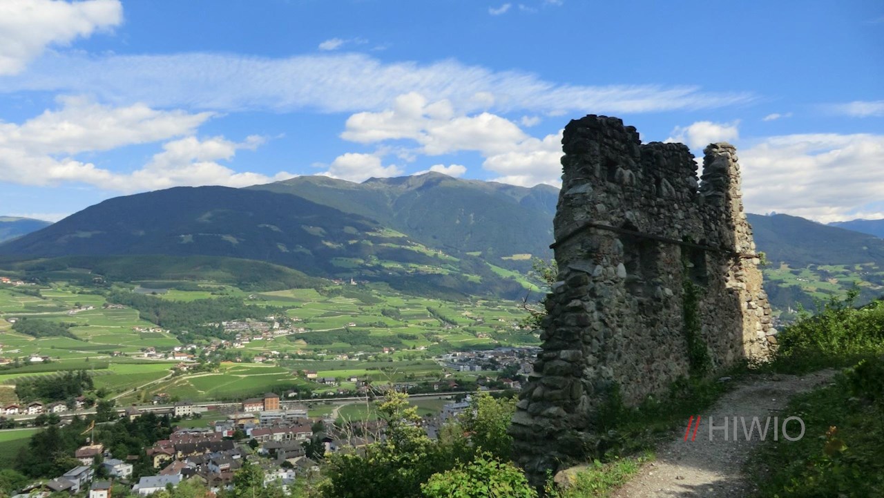 Drei Jahre später ordnete der Bischof den Bau des Schlosses Salern an, dem unser nächster Besuch gilt. Dazu wandert man wieder zum Carl-Toldt-Weg hinab und setzt den Weg auf ihm fort. Alsbald erblickt man auch schon die Mauerreste der einstmals wehrhaften Anlage, von der nur mehr Teile des Bergfrieds die Zeiten überdauert haben.