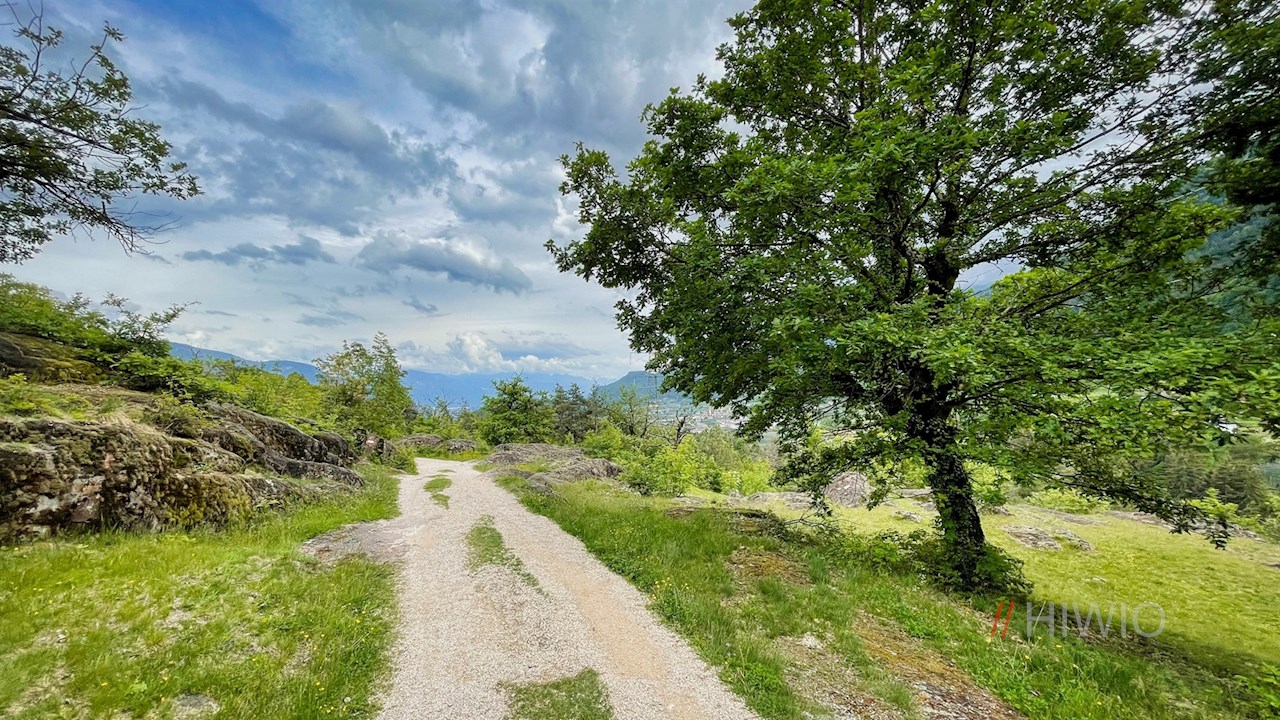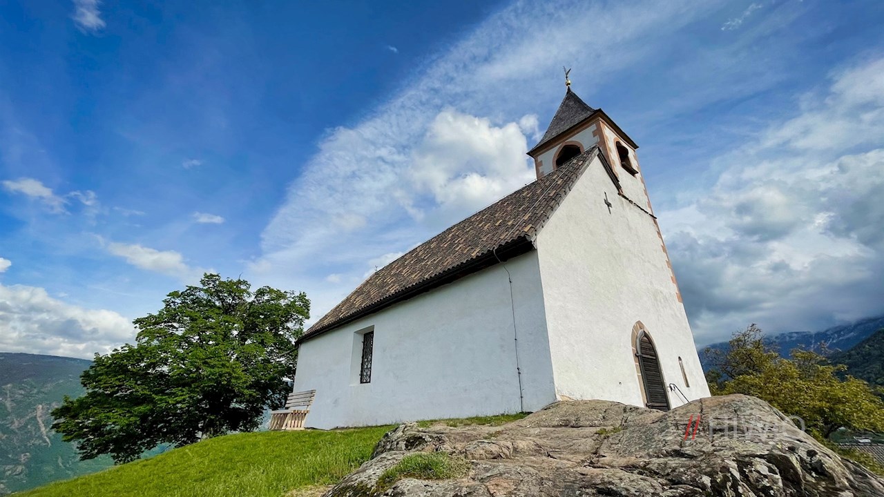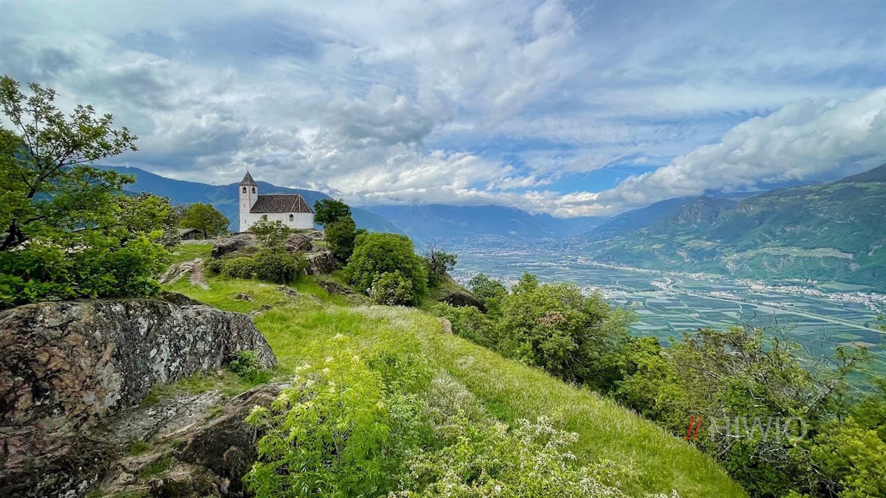 Nach 100 bewältigten Höhenmetern präsentiert sich das kleine Höhenheiligtum vor der atemberaubenden Kulisse des tiefer liegenden Etschtals. Einige Bänke laden zum Innehalten und Genießen dieser malerischen Idylle ein.