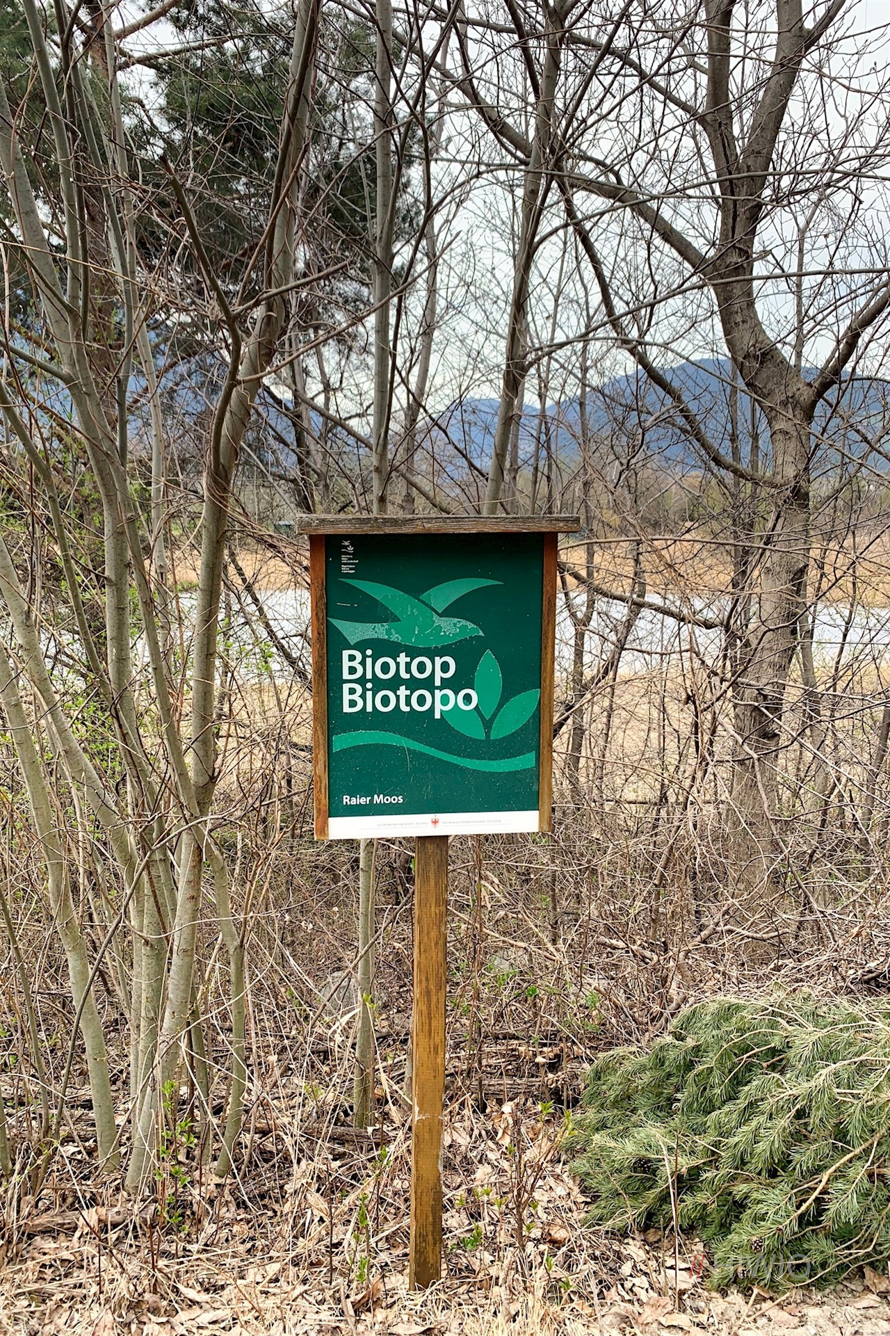 Wer möchte, kann das Raier Moos auf dem ausgeschilderten Naturlehrpfad umrunden. Wir aber wandern auf dem Apfelweg zum Biotop Laugen, einem kleinen, von Schilf und Auwald umsäumten Teich, weiter, der zahlreichen, teils gefährdeten Tierarten wertvollen Lebensraum bietet. Zu ihnen zählen beispielsweise Rohrsänger, Libellen oder Frösche.