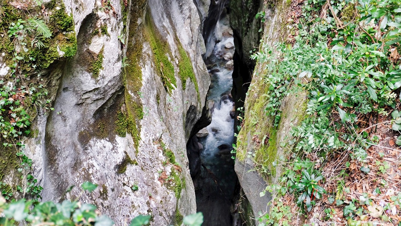 Dieser geht alsbald in den Weg Nr. 203 über, von dem wenig später der Weg Nr. 204 nach Puntésel abzweigt. Dieser führt durch Wiesen, Busch- und Waldhaine zu einer Steinbrücke (Ponticello). Sie geleitet sicheren Fußes über eine schwindelerregend tiefe Schlucht, die der Sturzbuch San Michele über Tausende von Jahren in den Felsen gearbeitet hat.