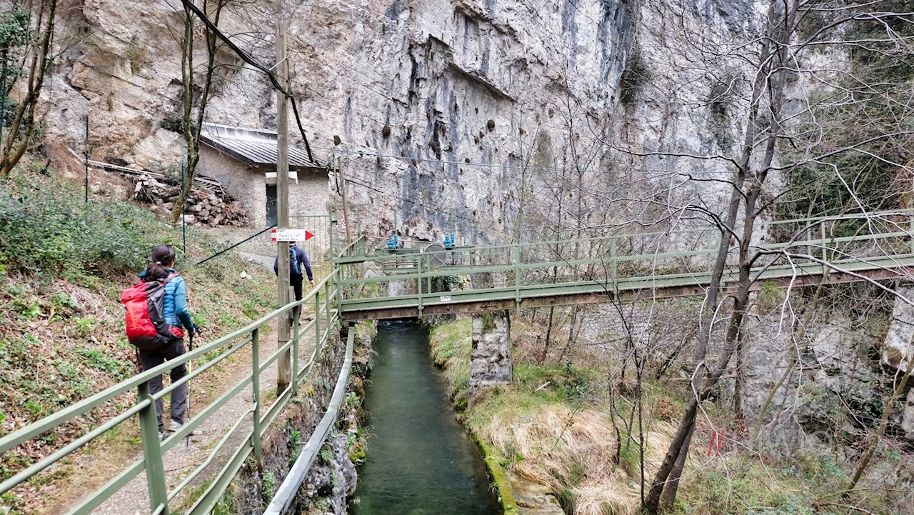 Eng an die Felswände geschmiegt, windet sich der schmale Pfad über Stufen, Brücken und einen beleuchteten Tunnel durch die beeindruckende Schlucht San Michele. Unterwegs erschließen sich atemberaubende Ausblicke auf den nunmehr tiefer liegenden Gardasee und den gegenüberliegenden Monte Baldo.