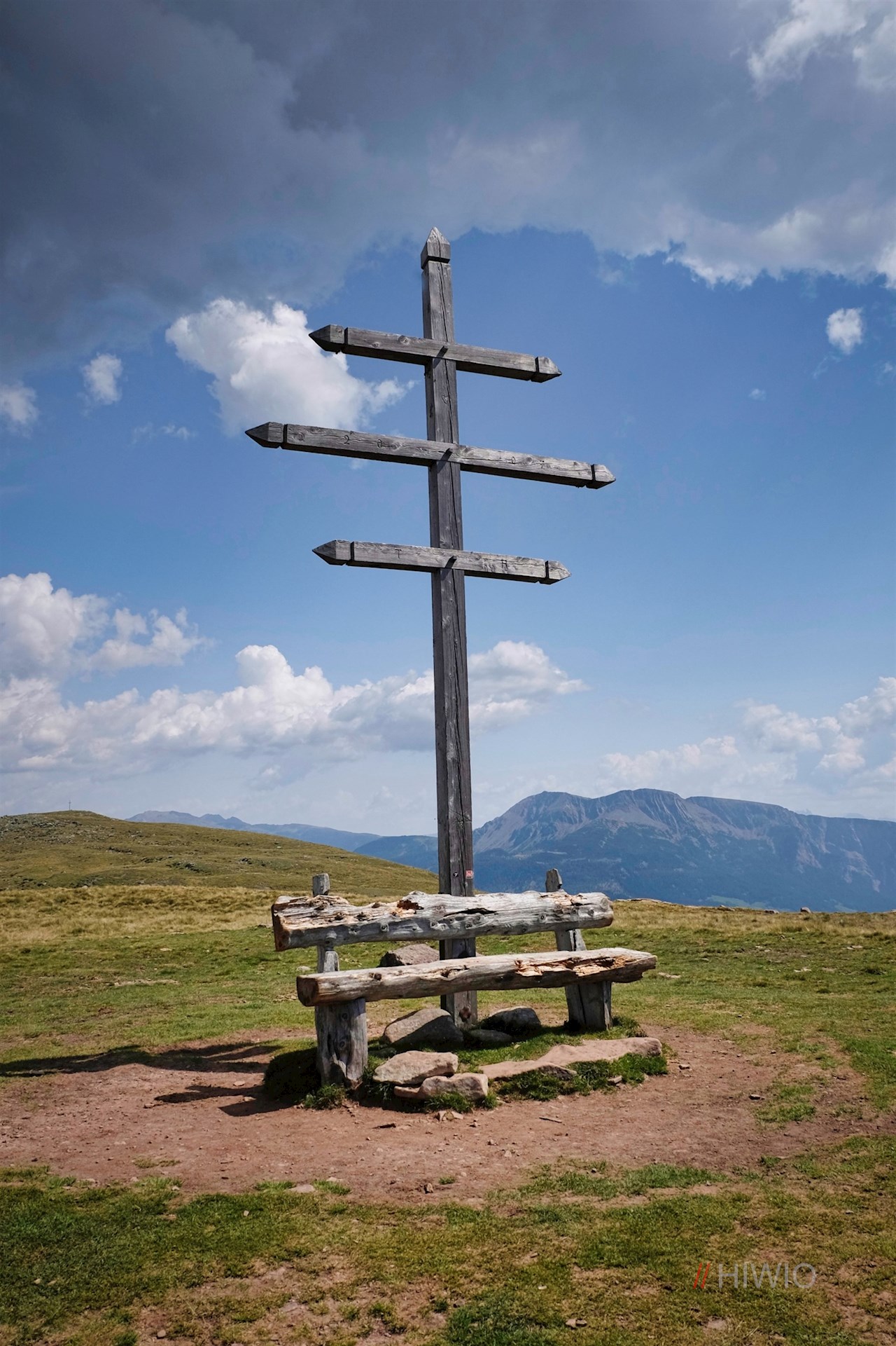 Öffnen sich bereits während des Anstiegs malerische Ausblicke, präsentiert sich auf dem 2.085 m hohen Kreuzjoch die umliegende Bergwelt wie auf dem Präsentierteller. Eine Aussichtsplattform gibt Aufschluss über die zahlreichen ringsum aufragenden Gipfel, zu denen auch der nahe Karkofel, die sagenumwobenen Stoanernen Mandln oder der Große Mittager gehören.
