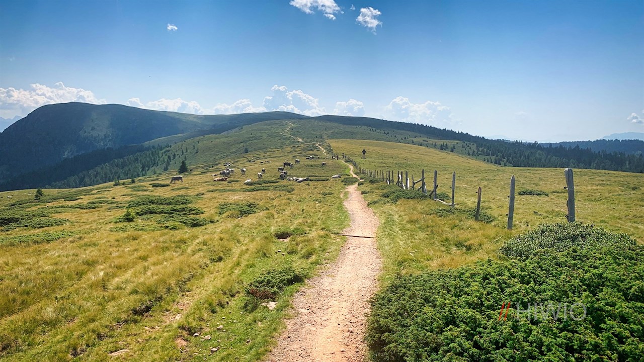 Neben dem anmutigen Flurkeuz zweigt der Europäische Fernwanderweg E5 zum bereits sichtbaren Wetterkreuz auf dem Kreuzjoch ab. Er führt im kaum merklichen Anstieg durch die offenen, sanft gewellten Bergweiden, in denen Almtiere ihre Sommerfrische genießen.