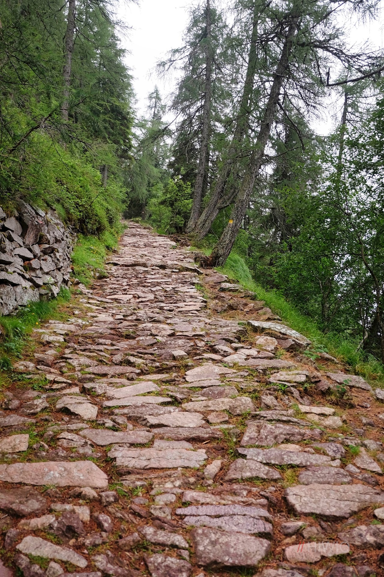 Dahinter steigt er zunächst sanft, dann ziemlich steil über alte, liebevoll angelegte Platten zur nächsten Weggabelung an, bei welcher der Wanderweg Nr. 15 durch einen lichten Lärchenwald zur nunmehr nahen Moschwaldalm wegführt.