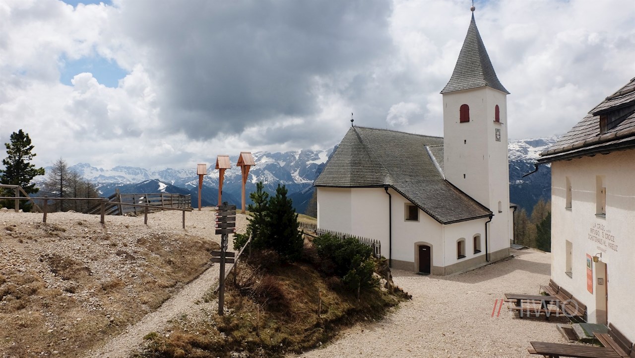 Dieser führt auf direktem Wege zur Wallfahrtsstätte Heiligkreuz/La Crusc am Fuße des schroffen Heiligkreuzkofel. Nach dem Besuch des Höhenkirchleins lädt das anliegende Heilig-Kreuz-Schutzhaus zur genüsslichen Einkehr ein.