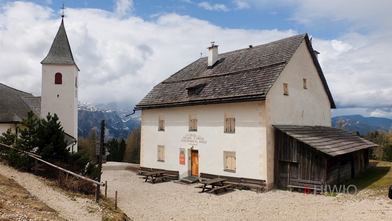 Zu Füßen des Heiligkreuzkofel thront das pittoreske Höhenkirchlein Heiligkreuz (La Crusc). Im anliegenden Heilig-Kreuz-Schutzhaus, das einst Pilger beherbergte, werden heute liebevoll zubereitete Südtiroler Gaumenfreuden serviert.
