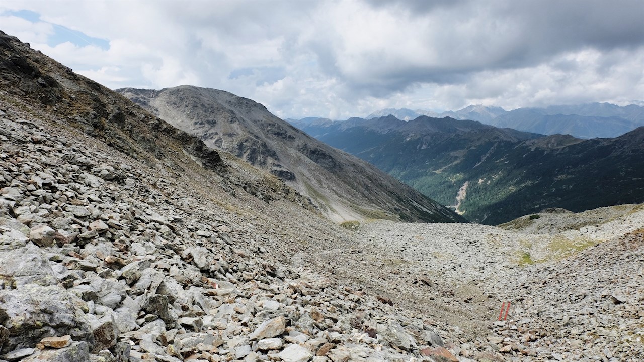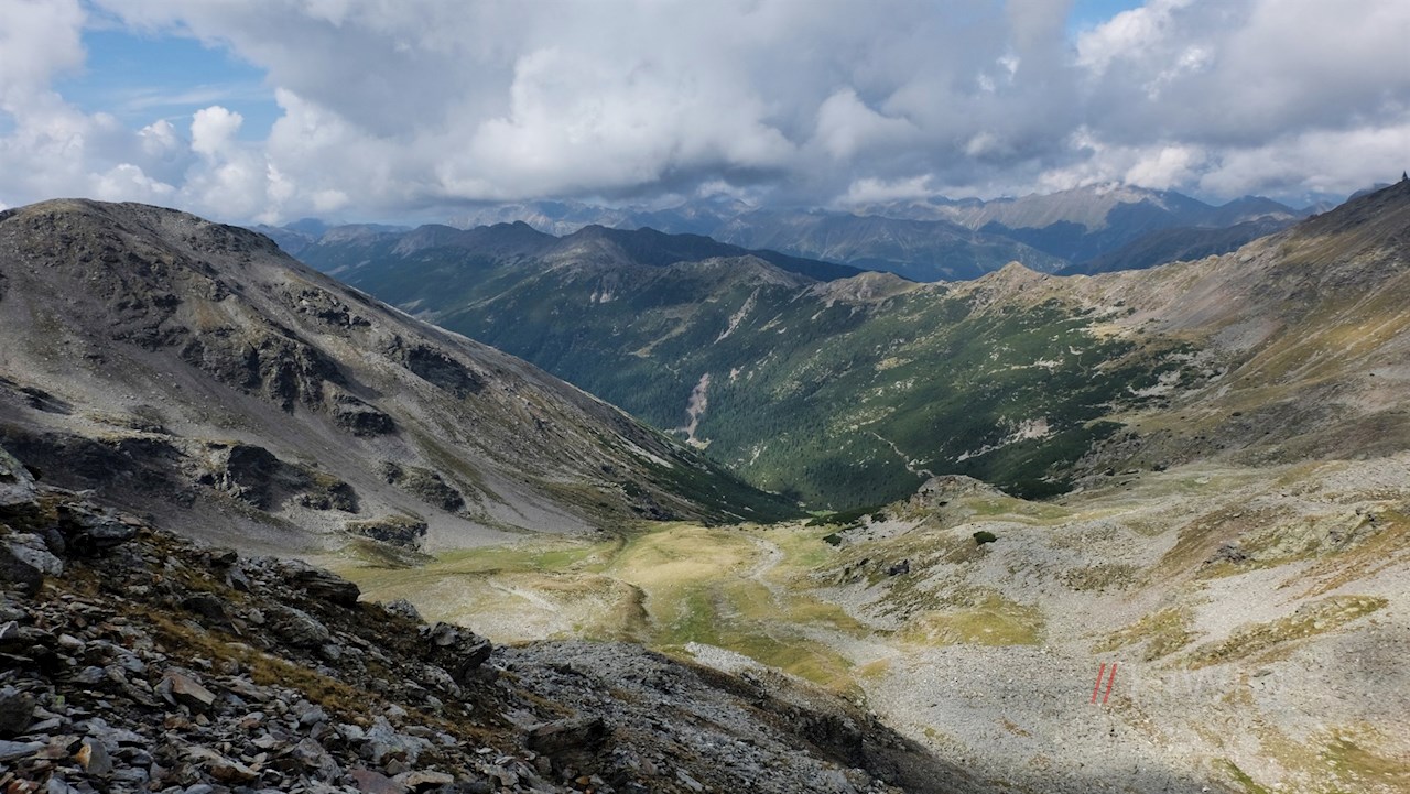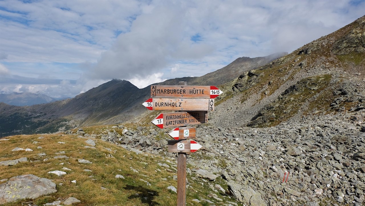 Nach rund drei Stunden erreicht man diesen Übergang zwischen dem Sarntal und dem Eisacktal, an dem rechts der Weg Nr. 13B in Richtung Jakobsspitze abzweigt.