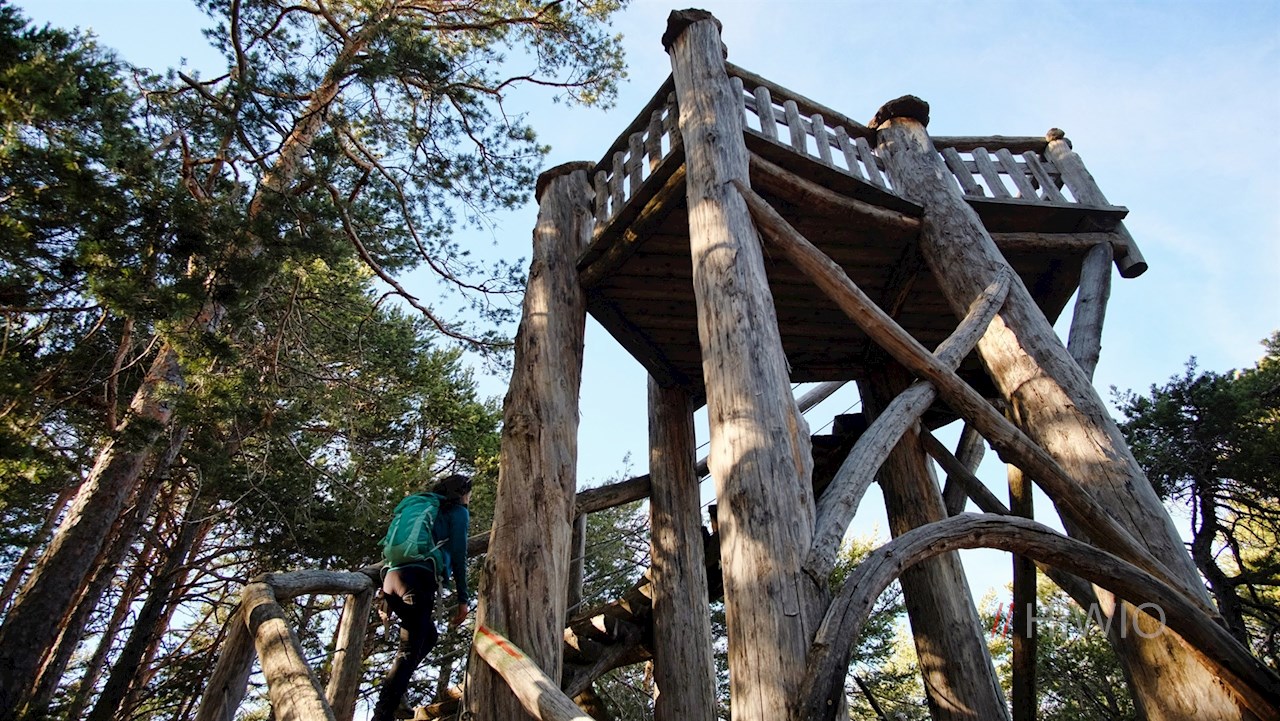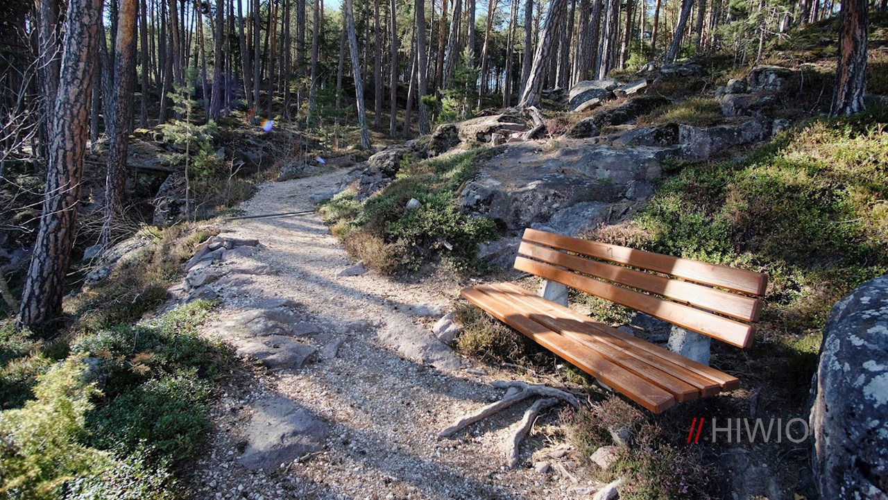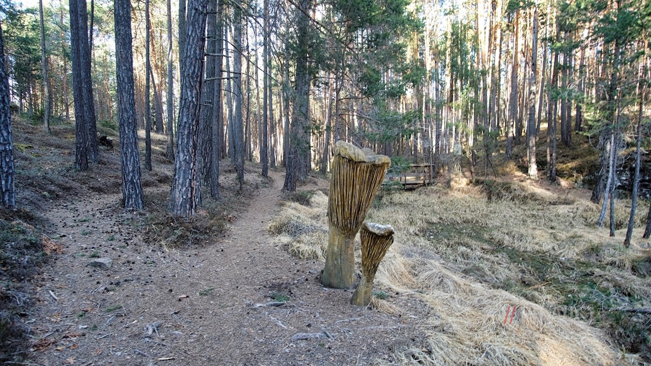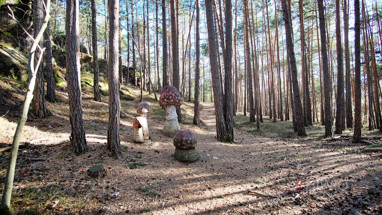 Zuvor aber sollte man sich einen kleinen Abstecher auf den Pilzeweg nicht entgehen lassen, der alsbald vom Weg abzweigt. Längs des liebevoll angelegten Naturlehrpfades erfährt man allerlei Wissenswertes über die einheimische Pilzwelt. Neben den aufschlussreichen Infotafeln erwarten den Wanderer überdimensional große Pilze, welche aus alten Baumstämmen geschnitzt wurden. Außerdem stößt man auf einen hölzernen Hochstand, auf dem sich ein malerischer Ausblick erschließt.