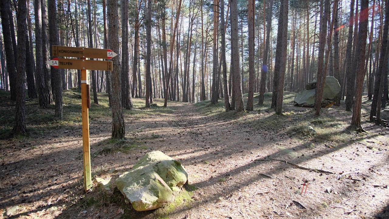 Weiterhin dem Waldweg folgend, gelangt man nach einer knappen Viertelstunde zum Wegweiser Nr. 5A, der den Weg zurück nach Telfen weist.