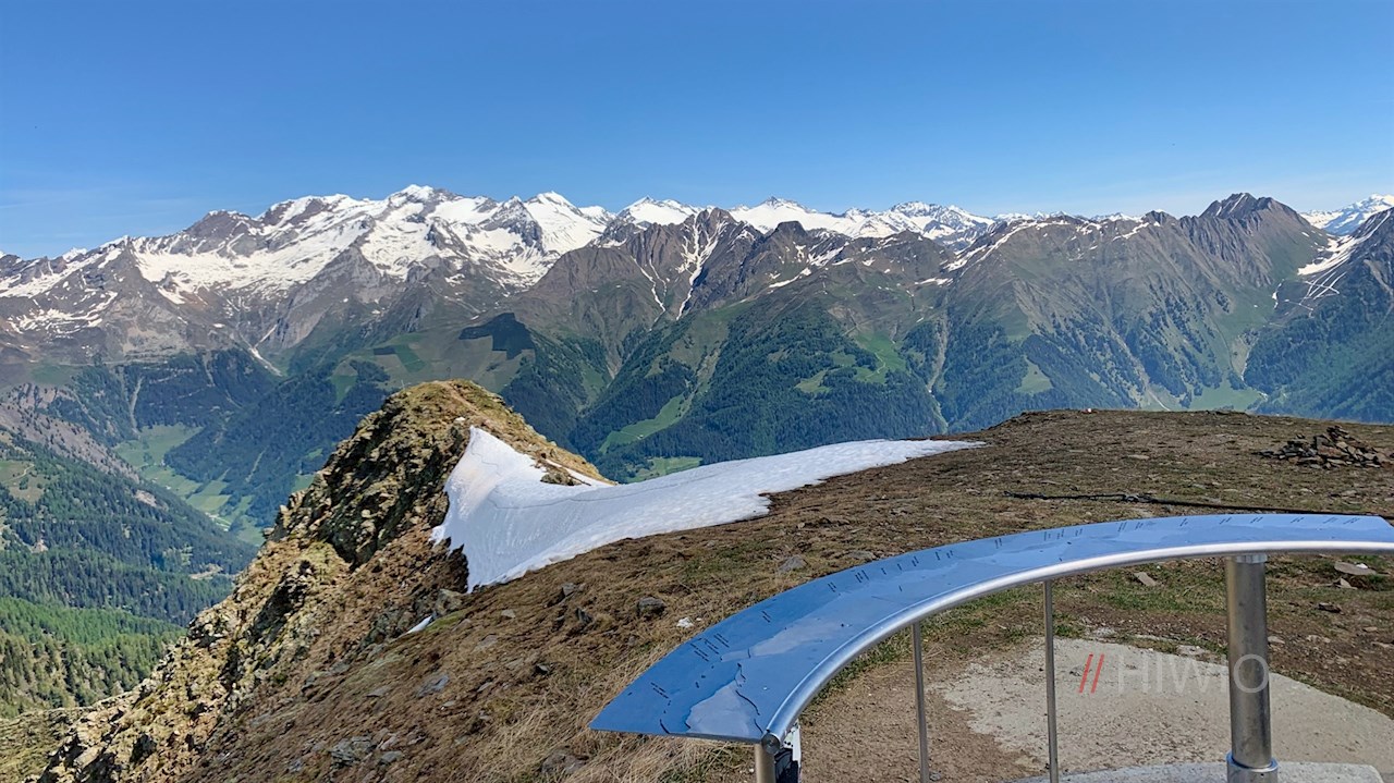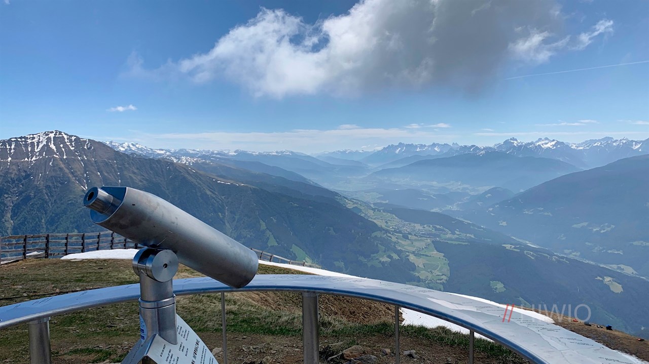 Neben dem Gipfelkreuz des Gitschbergs öffnet sich schließlich ein atemberaubend schönes Panorama: Ringsum erheben sich mehr als 500 Berge, von denen einige auf dem runden Panoramatisch verzeichnet sind. Selbst die weltberühmten Drei Zinnen sind in der Ferne auszumachen.