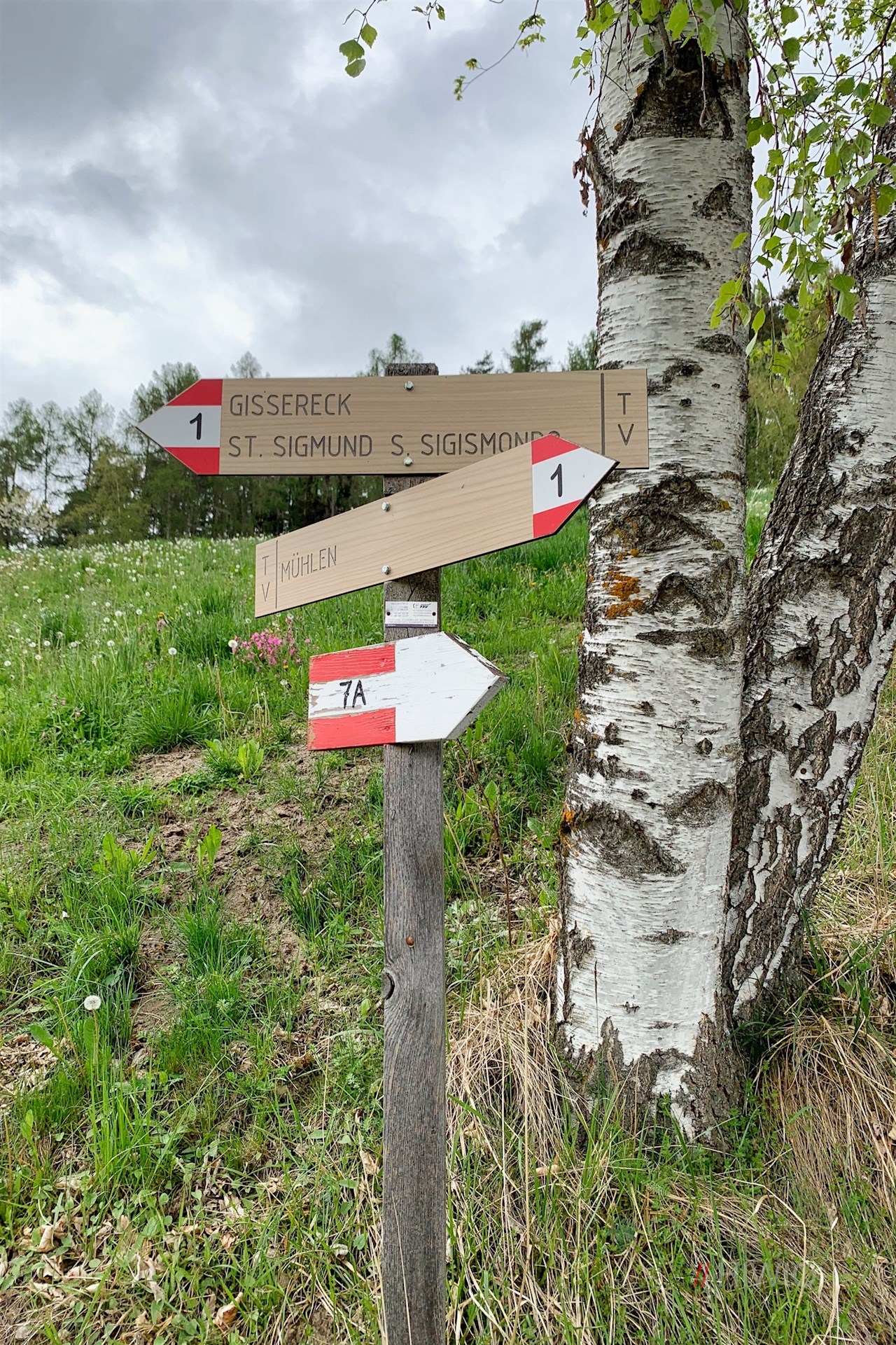 Er führt zunächst die Dorfstraße hoch, überquert auf einer kleinen Holzbrücke den Grünbach und geht nahe der Feuerwehrhalle in einen schönen Wanderweg über.
