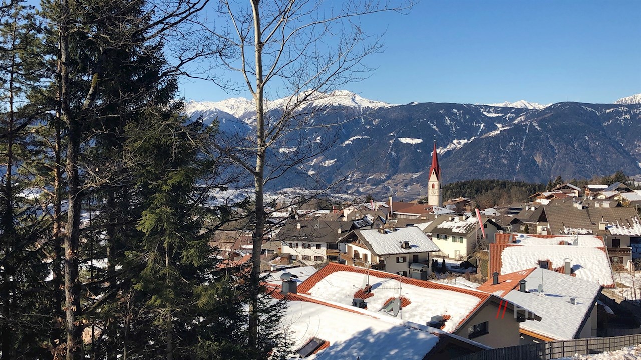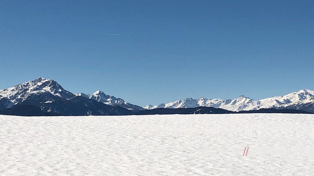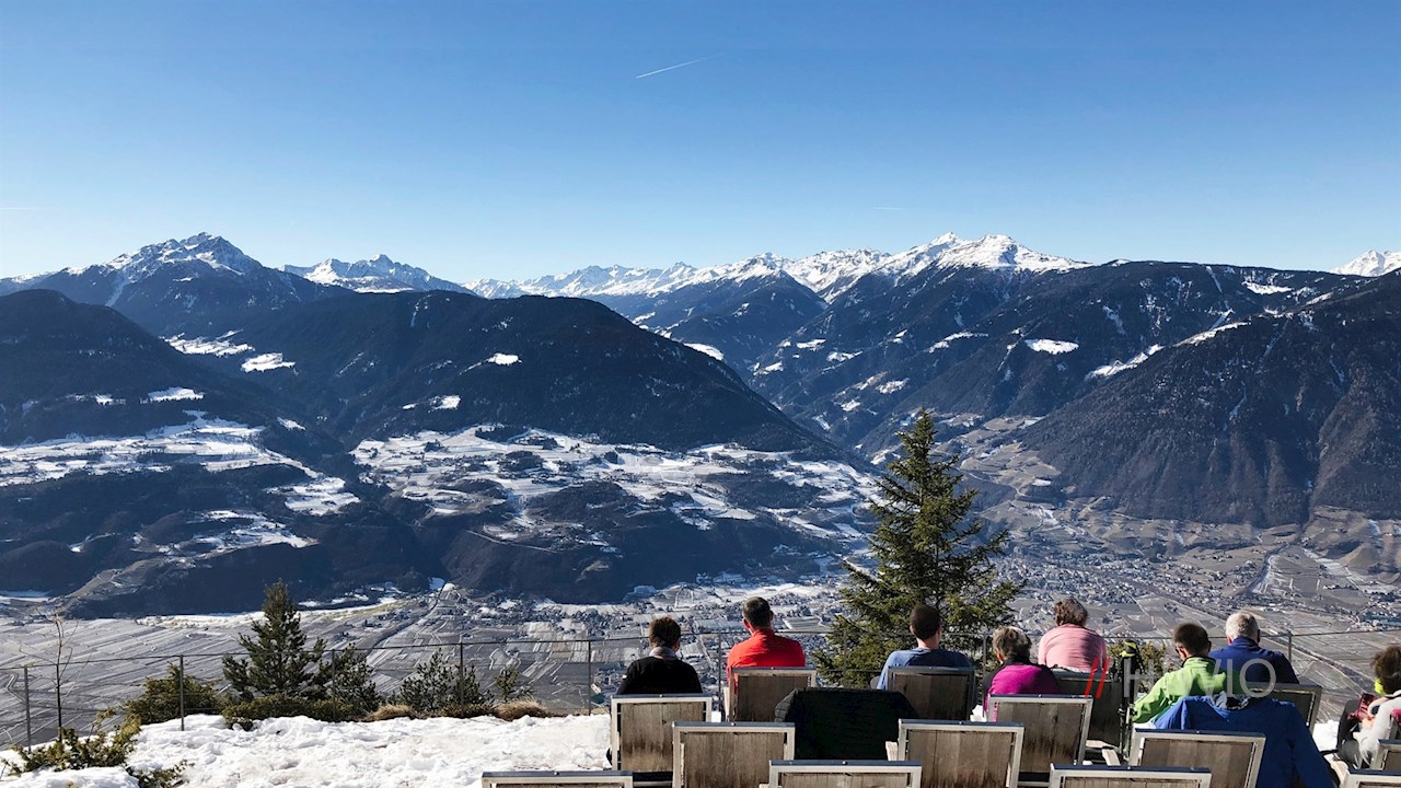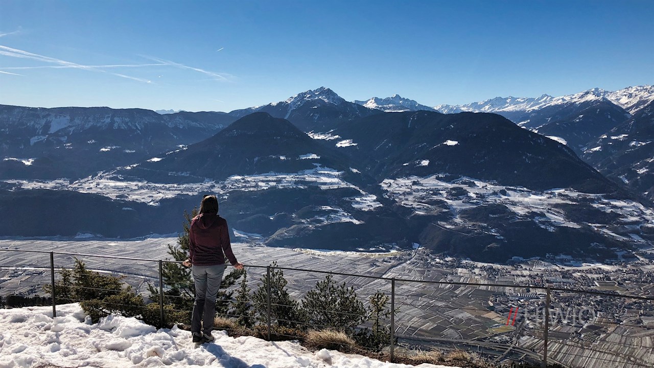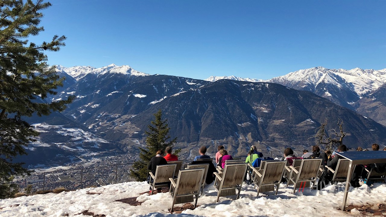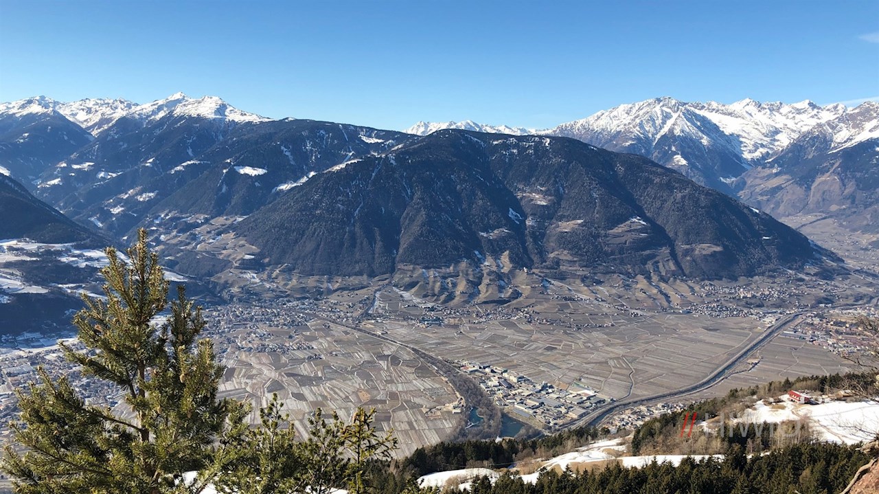 Wir überblicken das gesamte Etschtal zwischen dem Meraner Becken und dem Überetscher Plateau einschließlich der angrenzenden Berge. Der Blick fällt tief hinunter auf Lana, steigt hinauf auf die Hochebene von Tisens und Prissian und gipfelt auf dem gegenüberliegenden Laugen. Umsäumt wird die Szene von den zahlreichen, oft schneebedeckten Gipfeln der Ortlergruppe, der Ötztaler Alpen und der Texelgruppe.