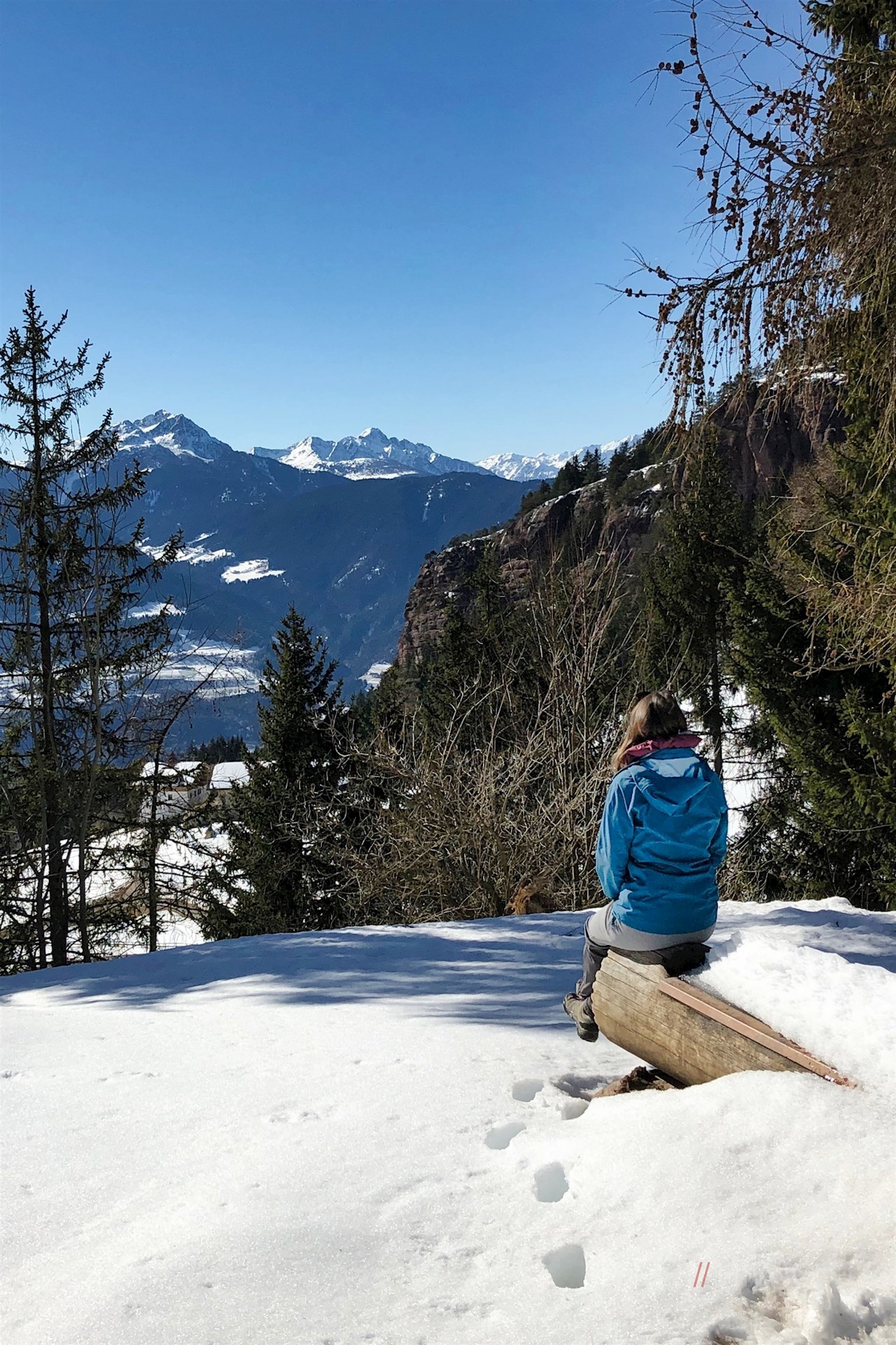 Nach ca. 50 Minuten erreichen wir eine Gabelung (leicht zu erkennen an der überdimensionierten Mistgabel am Straßenrand), an der wir nach links in Richtung Knottnkino abbiegen und einen flachen Waldweg einschlagen. Dieser führt durch einen dichten Tannen- und Fichtenwald, der immer wieder von Sonnenstrahlen durchflutet wird, die magische Bilder entstehen lassen. Er führt zuerst leicht bergauf, dann wieder bergab bis zu einer Kreuzung mit einer Landstraße und einem herrlichen Panoramablick auf Vöran und Umgebung.