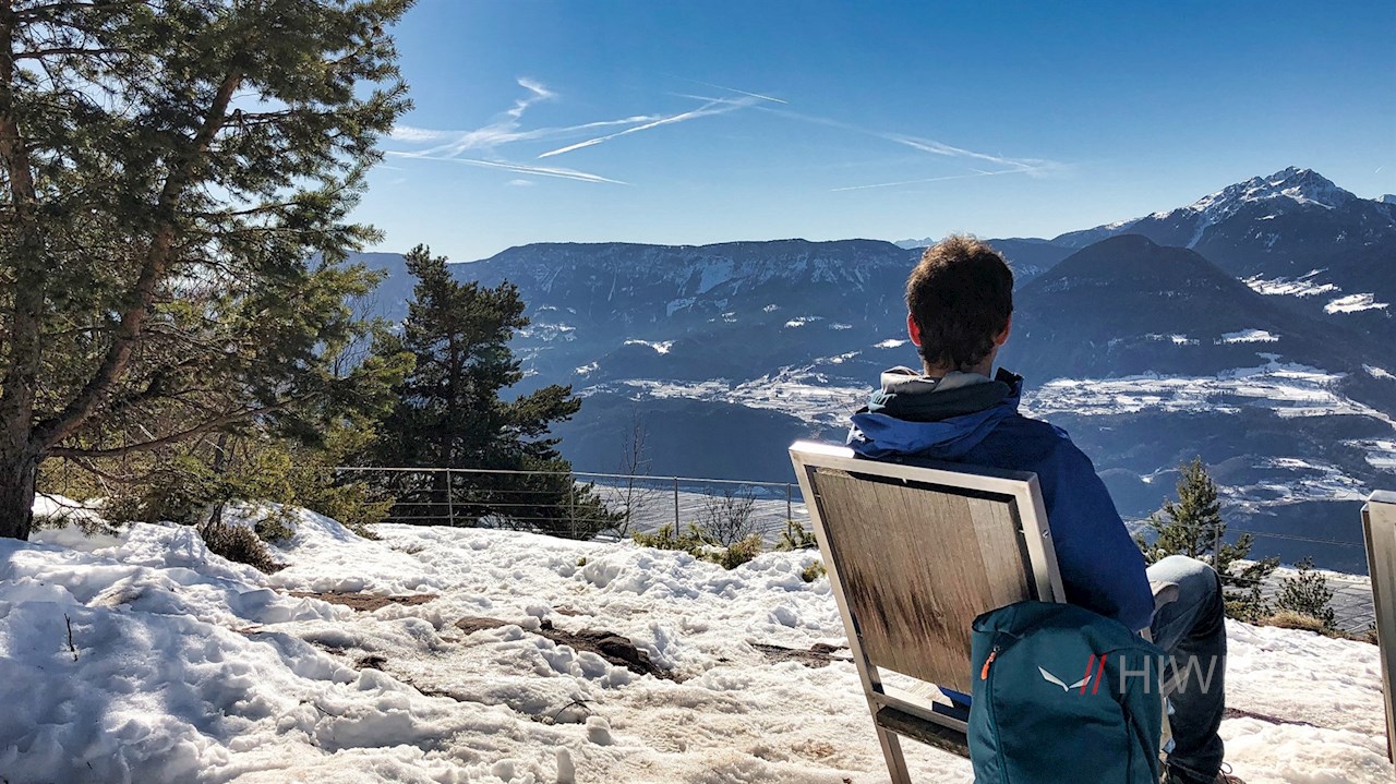Von dort aus beginnt ein zehnminütiger Aufstieg auf den Porphyrfelsen Rotsteinkogel, der sich zwischen den Dörfern Vöran und Hafling erstreckt. Gleich zu Beginn wartet dieser Abschnitt mit Ausblick auf die Texelgruppe im Norden und die Mendel sowie das Weiß- und Schwarzhorn im Süden auf. Auf dem äußersten Felsvorsprung dieses „Knottns“ angekommen, erwarten uns auf 1.465 m Höhe die Sitzreihen des Knottnkinos vor atemberaubender Bergszenerie.